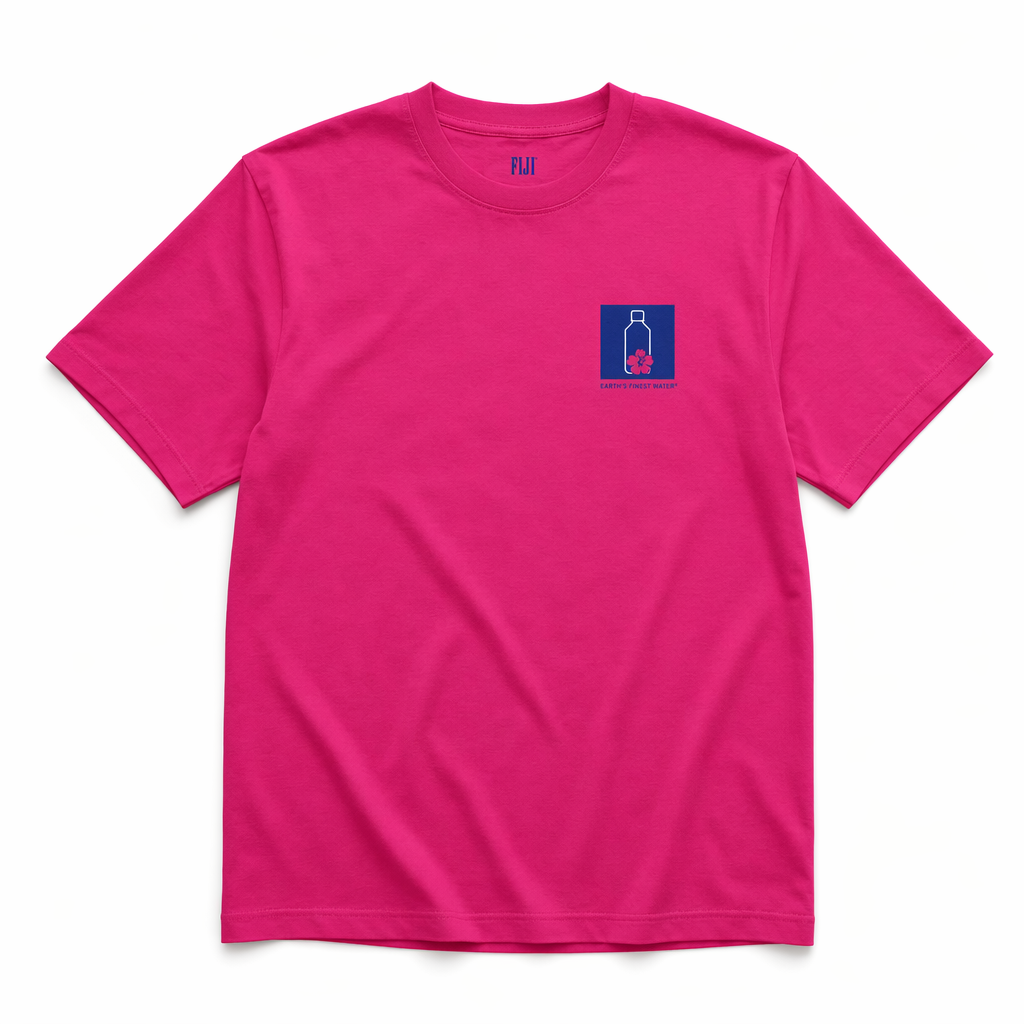 Photorealistic mockup of a minimal, high-fashion Gen Z tee using silhouette 06_golden-hawaii-t-shirt-arctic-blue.jpg, laid flat on a pure white studio background. The tee is solid hibiscus magenta (#E10098), made from premium combed cotton with a very smooth surface. Centered on the chest is a small, sharp square logo rendered in FIJI blue (#003DA5): inside the square, a simplified white outline of the iconic FIJI bottle with one small magenta hibiscus at the base. Under the square, in very small FIJI blue uppercase text: “EARTH’S FINEST WATER®”. On the back neck, just below the collar, a tiny FIJI blue wordmark runs horizontally, like a subtle designer tag. Lighting is bright and even, white-balanced to keep the magenta true and vibrant against the white ground, with delicate shadows at the sides to show volume. Camera angle is straight overhead, framed tightly to focus on the compact front graphic and overall silhouette, giving a bold yet clean statement that feels like merch from a cool gallery or boutique brand.