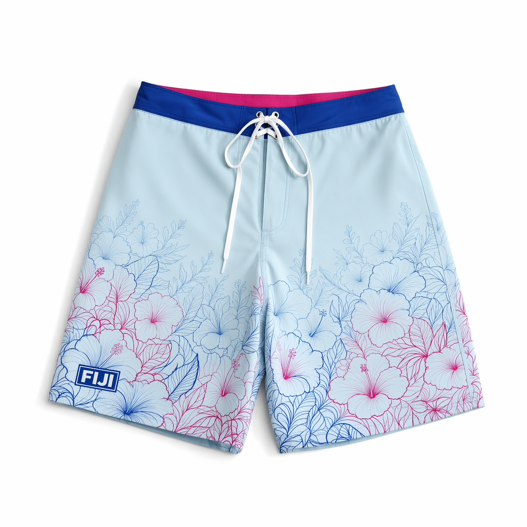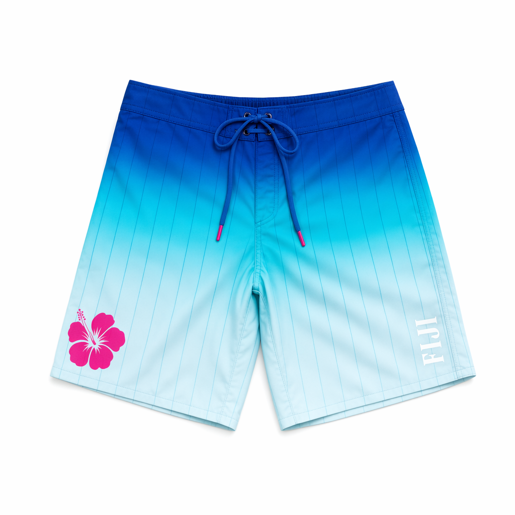 Photorealistic flat-lay of FIJI-branded men’s boardshorts using the provided silhouette as the exact pattern shape, laid perfectly flat on a clean pure white background. Fabric is a premium, smooth recycled performance microfiber with a soft, matte finish – no shine, feels like affordable luxury resort-wear. All-over print inspired by FIJI’s signature blue gradient: deep FIJI primary blue (#003DA5) at the waistband subtly ombré-fading down the legs into bright light blue (#00C1D5) and then into pale ice blue (#BBDDE6) near the hem. Thin vertical grid lines in slightly darker tones echo a subtle palaka check, but modern and minimal. A playful magenta (#E10098) hibiscus icon is placed near the left hem, stylized and graphic, not tropical-cheesy. Small, tonal FIJI wordmark in white, vertically oriented on the lower right leg, clean and confident. Waistband is fixed with a hidden elastic panel in back and a flat front with a FIJI blue drawcord tipped in magenta. Lighting is soft, diffused studio light from above, no harsh shadows, emphasizing smooth texture and color transitions. Camera is straight overhead, full product in frame, lots of breathing room of white around it for e-commerce usage. No props, no model, just the shorts and a crisp white field, modern and Gen Z-friendly.