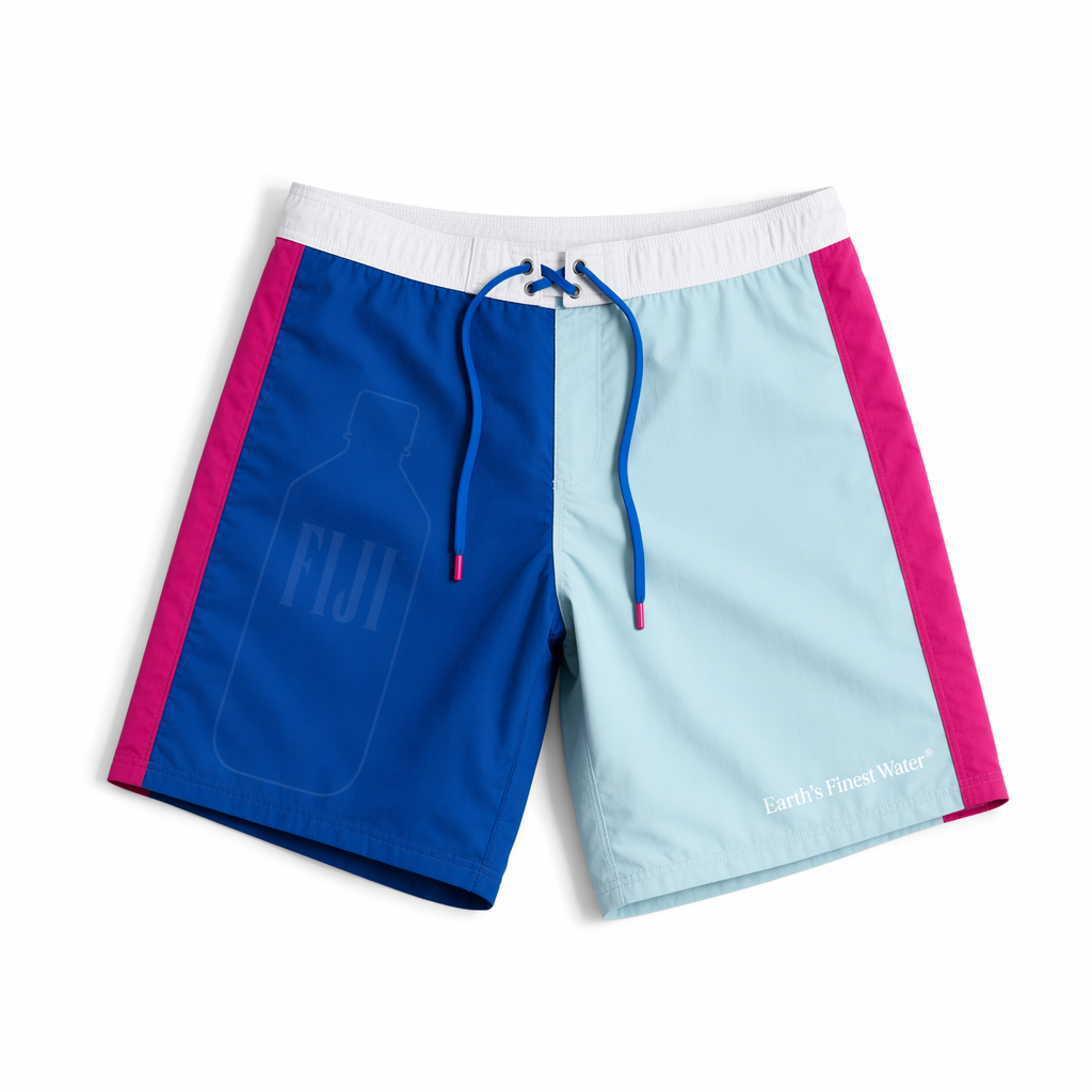 Photorealistic product shot of FIJI “pool-to-party” boardshorts using the provided silhouette as the exact shape, on a matte white studio backdrop. Shorts are made from a lightweight, quick-dry recycled nylon with a soft, almost brushed hand-feel, matte and premium. Design features a bold half-and-half color block: left leg in solid FIJI primary blue (#003DA5), right leg in solid light blue (#BBDDE6). Down the outer side seam of each leg, a wide magenta (#E10098) panel acts like a fashion stripe, creating the signature blue + magenta pairing. Across the front of the left leg, a tonal oversized outline of the iconic FIJI bottle is ghost-printed, barely-visible in a slightly darker blue for a subtle flex. On the right leg near the hem, small clean white text reads “Earth’s Finest Water®” in a fashion-forward, minimalist type treatment. Waistband is white with a FIJI blue drawstring tipped in magenta. Lighting is bright and even, slightly high-key, with soft edge shadows that keep the white background pure while grounding the shorts realistically. Camera is overhead, showing the entire silhouette centered with crisp detail on stitching, hem, and drawstring tips, minimal yet visually punchy for Gen Z social and e-comm.