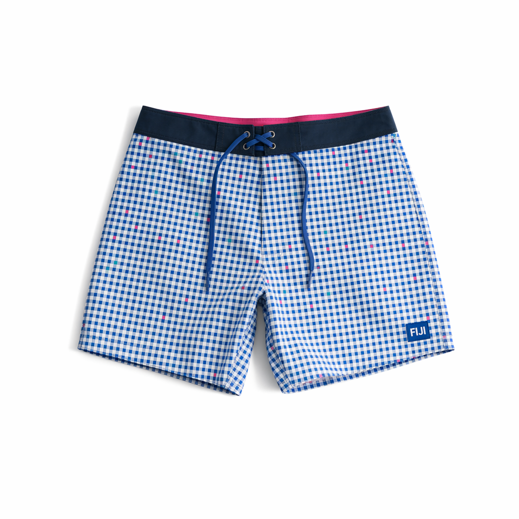 Photorealistic flat-lay of FIJI “Island Pixel” boardshorts using the provided silhouette shape, perfectly aligned on a seamless white background. Fabric: slightly textured recycled polyester with a soft-hand peach finish, matte and elevated. All-over pattern is a micro-check inspired by Hawaiian palaka but digitized for Gen Z: tiny squares in FIJI primary blue (#003DA5), light blue (#BBDDE6), and bright cyan (#00C1D5), with an occasional micro-square in hibiscus magenta (#E10098) creating a playful confetti effect. The pattern is tight and refined, reading almost like a techy beach gingham from a distance. On the lower left leg, a small woven label patch in FIJI blue with white FIJI logo sits cleanly, like a streetwear detail. Waistband is solid navy (#041C2C) with inner facing in magenta that just barely peeks out at the top edge, plus a flat FIJI blue drawcord. Lighting is soft and balanced, with gentle shadows under edges and subtle specular highlights on the fabric texture to show quality. Camera: top-down, centered, leaving negative space of pure white all around so the vibrant micro-check becomes the hero. No extra objects; minimalist fashion editorial energy.