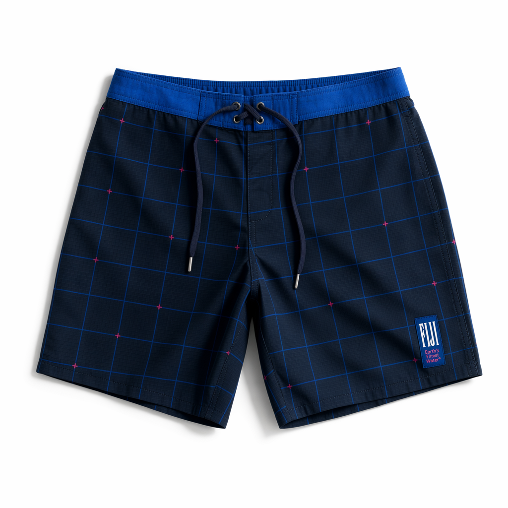 Photorealistic top-down product render of FIJI “Island Grid” boardshorts using the provided silhouette, against a clean white studio background. Fabric looks like a premium technical woven with a subtle ripstop grid, matte and durable but soft, conveying everyday wearability. Base color is navy (#041C2C). Over this, a large-scale tonal grid pattern echoes a modern palaka: thin lines in FIJI blue (#003DA5) form big squares, and at random intersections, tiny magenta (#E10098) plus-signs add a playful, almost streetwear accent. On the right leg near the hem, a small vertical rubberized patch in FIJI blue carries the FIJI logo in white and the phrase “Earth’s Finest Water®” in tiny magenta type. Waistband is FIJI blue with an internal elastic and a navy drawstring, featuring metal tips with a satin finish. Lighting is controlled and soft, from above slightly to one side, giving a gentle directional shadow along one edge while preserving the purity of the white background. Camera is a straight overhead flat-lay shot, shorts centered and fully visible, detailed enough to see the ripstop texture and printed grid, stylish yet relaxed for Gen Z who want subtle graphic details.