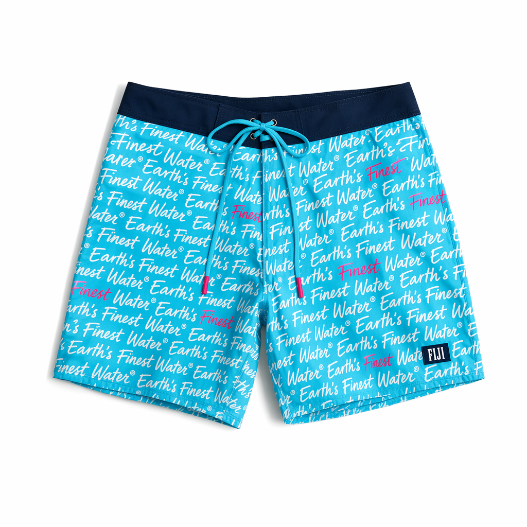Photorealistic flat-lay of FIJI “Ocean Script” boardshorts, using the provided silhouette as the exact shape, laid neatly on a solid white studio backdrop. Fabric: smooth, slightly stretchy recycled swim fabric with a buttery matte finish. The shorts are primarily bright light blue (#00C1D5), evoking tropical water. Wrapping around both legs is a continuous hand-drawn script pattern in white that repeats the phrase “Earth’s Finest Water®” in a casual, flowing style, like someone doodling in a journal at the beach. Every few repetitions, key words like “Finest” or “Water” are highlighted in magenta (#E10098), seamlessly integrated into the script. On the lower left leg, a small FIJI logo in navy sits inside a tiny, crisply edged rectangle. Waistband is navy (#041C2C) with a FIJI blue drawcord and magenta dipped tips, tied once for a relaxed look. Lighting is bright and even, almost editorial catalog style, with delicate shadows that keep the shorts feeling real and tactile on the white surface. Camera: overhead, centered, with enough negative space to crop for social; focus is high to read the text pattern without distortion.