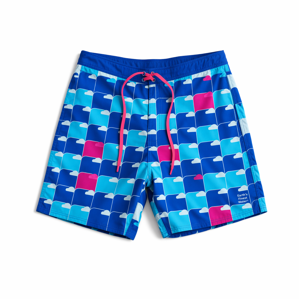 Photorealistic overhead image of FIJI ‘tile logo’ boardshorts, keeping the supplied silhouette exactly for outline and length. Fabric is structured yet soft recycled polyester with a brushed matte finish, reminiscent of premium streetwear swim hybrids. Color: ice-light blue (#BBDDE6) base with an allover tiled grid of small square icons referencing the FIJI bottle silhouette in alternating FIJI blue (#003DA5) and magenta (#E10098). Each tiny square is clean and sharp, giving a playful but orderly pattern Gen Z could wear from beach to café. Narrow waistband with internal elastic, exposed flat magenta drawcord. Discreet tonal FIJI wordmark printed near the right pocket opening, plus a tiny ‘Earth’s Finest Water®’ tag at back. Shot on pure white seamless background, bright softbox lighting from above, slightly stronger highlight on upper left to show texture; crisp, natural shadows contour the shorts and leg openings. Camera top-down with enough negative space around to feel airy and minimal.