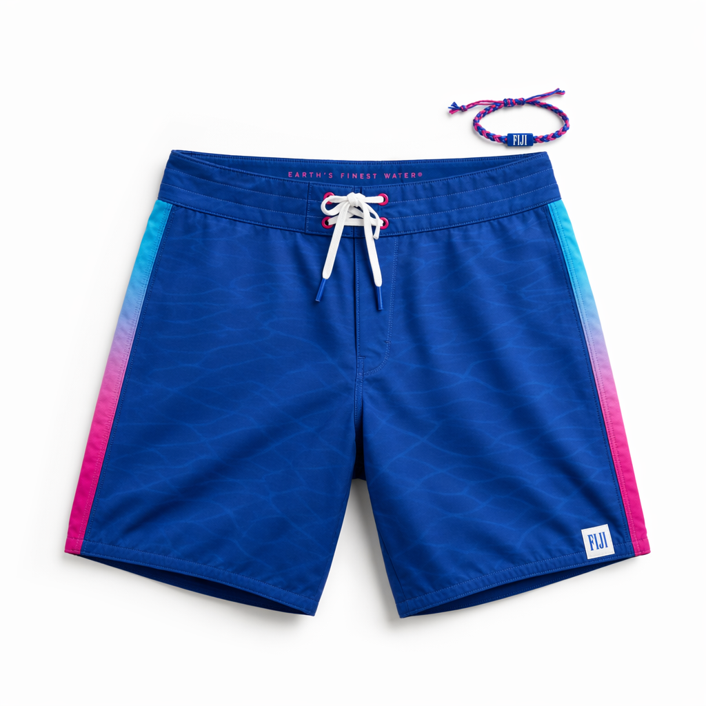 Photorealistic front view of FIJI-branded men’s boardshorts using the provided silhouette as the exact garment shape, laid flat on a clean white seamless background. Fabric is premium, slightly textured recycled polyester with a soft matte finish, mid-thigh length. Main color is saturated FIJI primary blue (#003DA5) with a subtle tonal wave pattern inspired by water ripples. Side panels feature a vertical gradient strip from bright light blue (#00C1D5) to hibiscus magenta (#E10098), echoing the FIJI bottle gradient. A small, woven FIJI logo tag in white and FIJI blue is placed at the hem, and “Earth’s Finest Water®” is delicately screen-printed in tiny magenta text along the inner waistband. White drawstring with matte FIJI-blue aglets; eyelets are enamel-coated in magenta for a playful pop. Lighting is bright, soft studio light from above with gentle shadows to show depth and folds, no harsh reflections. Camera is top-down, slightly closer than full frame to highlight fabric quality and color. Styling is minimal and Gen Z–leaning: a single braided friendship bracelet in FIJI blue and magenta placed near the waistband for scale and vibe.
