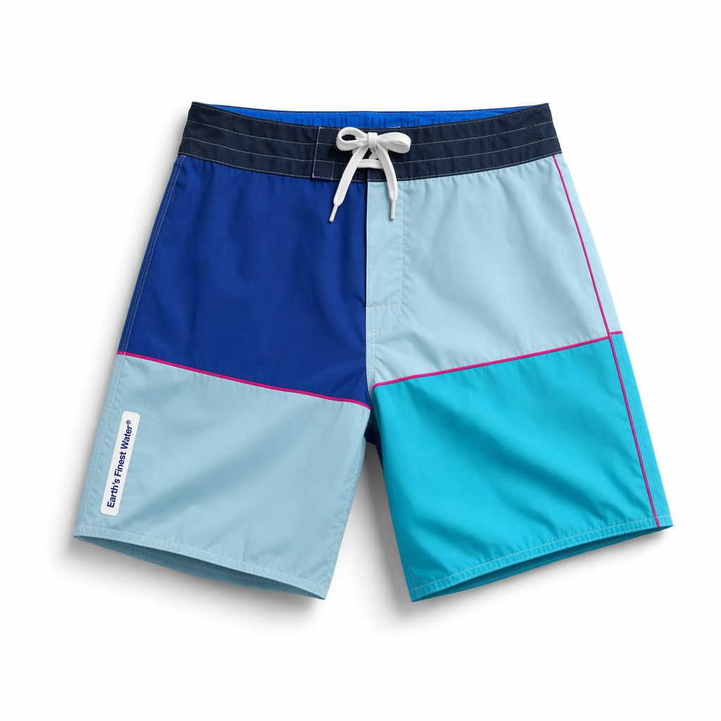 Photorealistic top-down shot of FIJI ‘tile wave’ boardshorts, matching the silhouette shape exactly, on a pure white background with subtle shadowing. Fabric is quick-dry recycled nylon with a slightly crisp, technical feel, matte finish. The shorts are divided into large color-blocked rectangles inspired by tiled pools and the square bottle: alternating panels of FIJI blue (#003DA5), light blue (#BBDDE6), and bright light blue (#00C1D5). Between some panels, thin hibiscus magenta (#E10098) piping acts as accent seams. Waistband is solid navy (#041C2C) with a FIJI blue internal lining just peeking above the edge. White flat drawcord, slightly thicker and textured, tied in a loose knot for a casual vibe. Branding is minimal: on the left leg near the hem, a vertical white rubberized label reads “Earth’s Finest Water®” in FIJI blue; on the back right waistband (barely visible from subtle angle) a tiny debossed FIJI wave icon. Lighting is bright, with a soft gradient from top to bottom to emphasize the color blocks; small, realistic fabric wrinkles around the crotch and waistband show authenticity. Camera is overhead, slightly off-center crop to feel editorial but still product-focused for Gen Z social content.