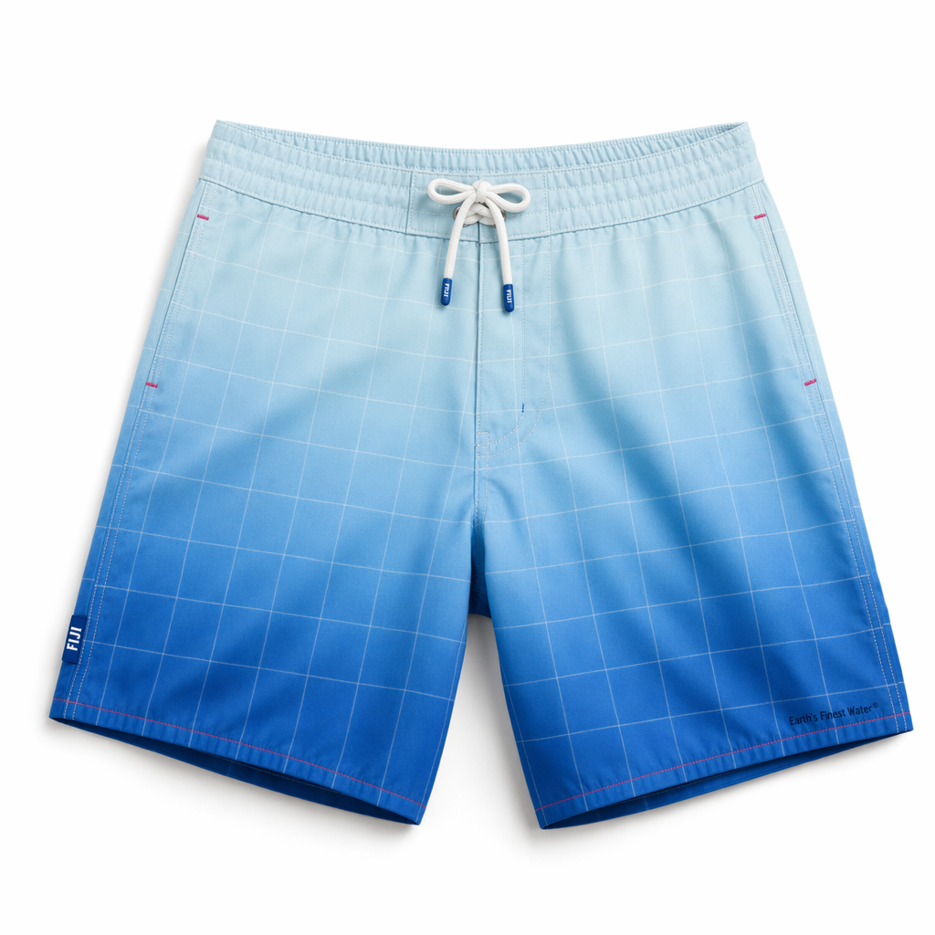 Photorealistic white-background flat-lay of FIJI ‘aqua fade check’ boardshorts, following the exact silhouette, styled for a Gen Z street-meets-beach look. Fabric is soft recycled polyester with a very fine twill texture, matte and non-reflective. Overall pattern is a gentle ombre from light blue (#BBDDE6) at the waistband to FIJI blue (#003DA5) at the hem, overlaid with a subtle white check pattern formed by thin intersecting lines, referencing pool tiles and the brand’s square geometry. Hibiscus magenta (#E10098) appears as minimal accent: tiny stitched bartacks at pocket openings and a slim stitched line above the hem. Waistband is elastic with a slightly gathered look; white round drawcord with small FIJI blue rubber-dipped tips. Left leg near the side seam carries a small vertical FIJI logo in white on a FIJI blue woven tab; right leg hem has micro text “Earth’s Finest Water®” printed in navy. Lighting is crisp, with slight shadow under the edges and a soft highlight across the center to showcase the gradient. Camera is top-down, shorts centered with subtle asymmetrical crop for a casual but premium vibe.
