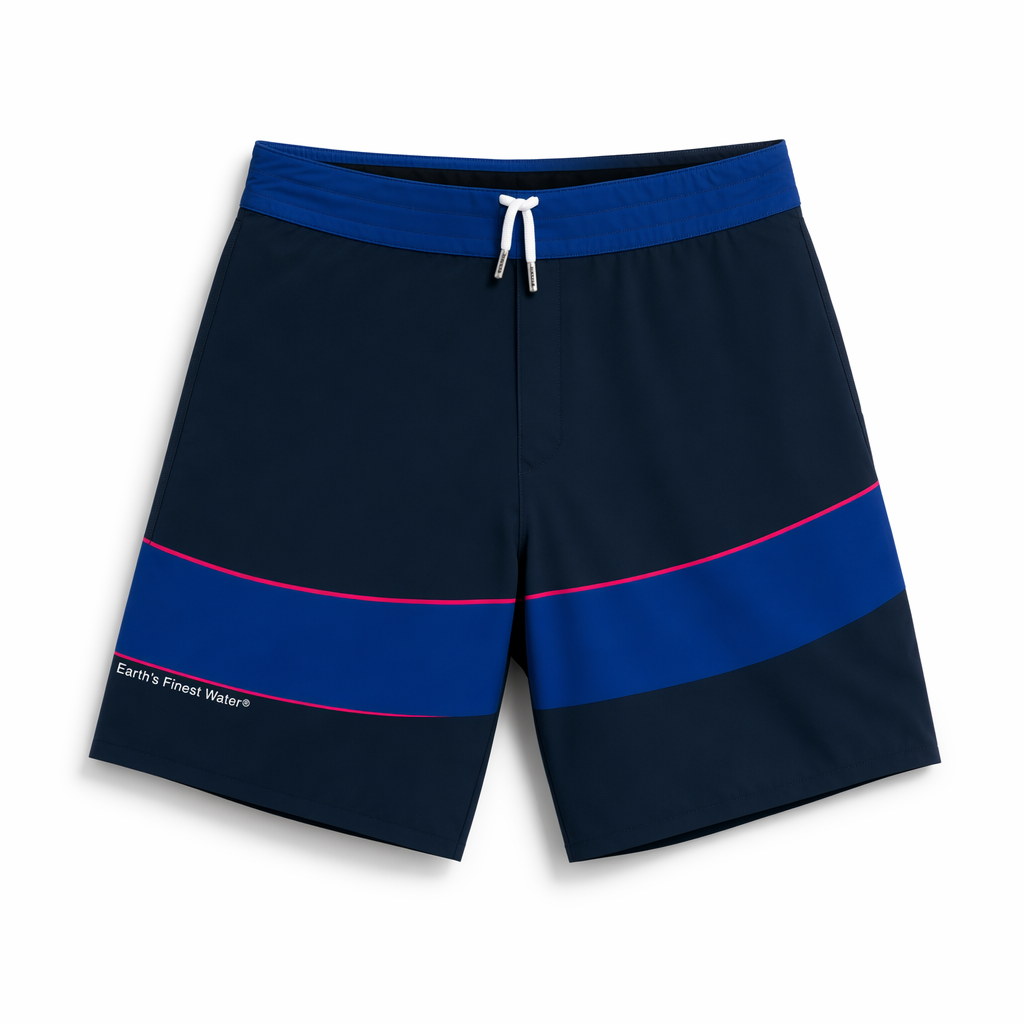 Photorealistic studio flat-lay of FIJI ‘minimal tide’ boardshorts, following the exact silhouette shape, on a high-key white background tailored to Gen Z minimalist taste. Fabric is high-quality recycled stretch blend with a super-clean matte texture, very smooth. Short is predominantly navy (#041C2C) for a versatile, wearable base. A bold, slightly curved band in FIJI blue (#003DA5) sweeps across both legs near mid-thigh, with a razor-thin hibiscus magenta (#E10098) line tracing its upper edge—like a tide line on the shore. Waistband matches FIJI blue band, with an internal elastic and a hidden closure; only a short white drawcord loop is visible at center front, tipped with tiny metal aglets engraved with a hibiscus motif. On the lower left leg, flush with the magenta line, small white sans-serif text reads “Earth’s Finest Water®”, understated but clear. Lighting is bright and soft from top and slightly left, producing gentle directional shadows that highlight the sweep of the band and the structure of the shorts. Camera is directly overhead, composition centered and very clean, no props, leaning into effortless, elevated resort energy.