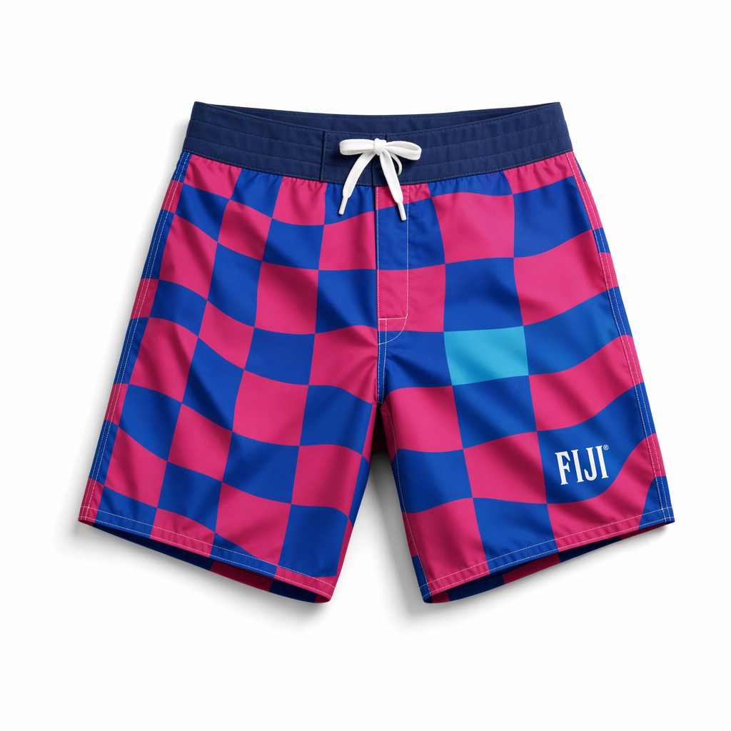 Photorealistic top-down product image of FIJI ‘checker tide’ boardshorts using the supplied silhouette for precise shape and leg opening. Material: midweight recycled stretch fabric with a dry handfeel, designed for swimming and lounging. Print: a large-scale wavy checkerboard pattern that alternates between FIJI primary blue (#003DA5) and hibiscus magenta (#E10098), with some check squares fading into lighter cyan (#00C1D5) for depth. The waves in the check mimic water ripples, giving a trendy, skate-meets-beach aesthetic for Gen Z. The FIJI logo appears once, clean and white, centered on the left leg within one blue square, and ‘Earth’s Finest Water®’ is micro-printed along the inner waistband, not visible from this angle. Waistband is solid navy with a hidden elastic and a white flat drawcord. Shot on pure white backdrop, high-contrast studio light slightly from the left to emphasize folds and hems, natural soft shadows under the garment, minimalistic composition with the shorts centered and filling most of the frame.