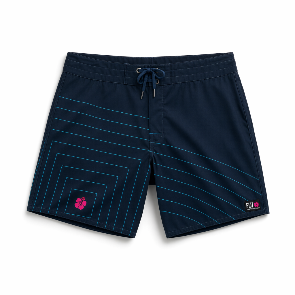 Photorealistic flat-lay of FIJI ‘square wave’ boardshorts, adhering to the given silhouette exactly. Fabric: premium quick-dry swim canvas with subtle texture, not shiny. Base color is deep navy (#041C2C). Over this, there’s a minimalist pattern of fine neon aqua lines (#00C1D5) forming concentric squares that ripple outward from the bottom-left leg, referencing FIJI’s iconic square bottle and water ripples. A single small magenta hibiscus icon (#E10098) sits at the center of the ripple. Branding is subtle: a small woven label at the bottom hem with FIJI logo in white and magenta and the line ‘Earth’s Finest Water®’. Waistband is navy with internal elastic and a tonal blue drawcord; metal eyelets in matte silver. Shot on a stark white background, soft neutral lighting from overhead with slight falloff toward the edges for an editorial product feel, gentle, realistic shadows around waistband and leg openings. Camera is directly overhead, high resolution, tight composition that highlights the graphic ripple and premium details.