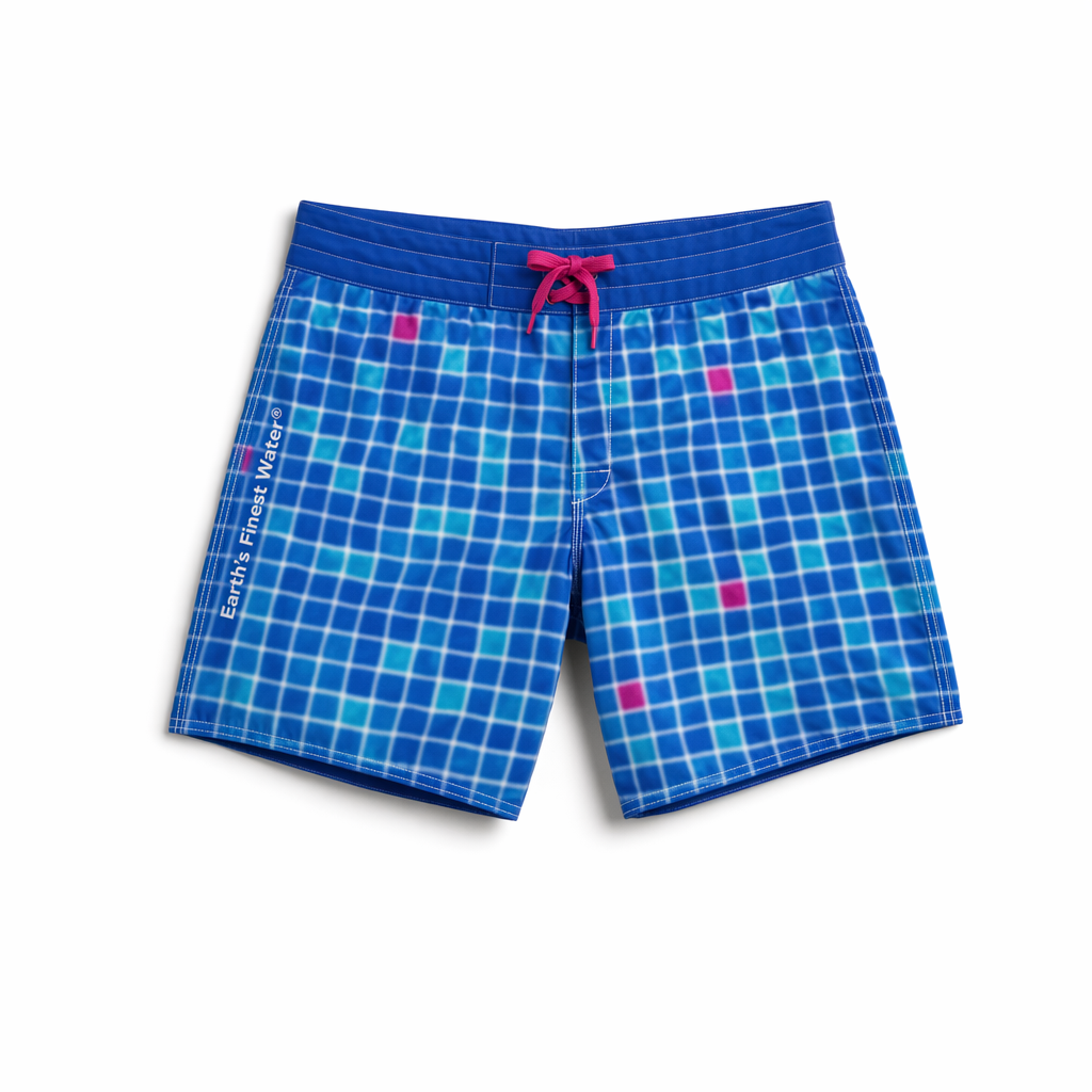 Photorealistic overhead view of FIJI ‘pool tile’ boardshorts, using the exact outline and proportions from the provided silhouette. Material: smooth recycled microfiber, cool to the touch with a very subtle sheen. Print: an allover mosaic tile pattern inspired by luxe pool bottoms, with small irregular squares in varying FIJI blues (#003DA5, #005EB8, #00C1D5) and occasional magenta (#E10098) tiles sprinkled in a 1:10 ratio as highlights. The tiles are softly blurred at the edges to suggest refraction through water. On the left leg, a vertical, understated ‘Earth’s Finest Water®’ in white is integrated between tile columns, aligned with the side seam. Waistband is solid FIJI blue with a contrasting magenta flat drawcord. Shot on clean white background, bright diffused light from above, with realistic shadow beneath the lower edge of the shorts to give dimension; no props. Camera is top-down, mid-distance so the pattern clearly reads as pool tiles, and fine stitching and hem details are visible.