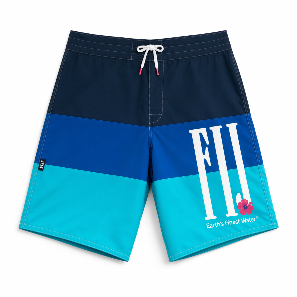Photorealistic flat-lay of FIJI ‘capsule logo’ boardshorts matching the supplied silhouette exactly. Fabric: slightly structured recycled twill-like swim fabric, matte, giving an elevated streetwear feel that works in and out of water. Color blocking: top third (waistband area) in navy (#041C2C), middle band in FIJI blue (#003DA5), bottom third in bright aqua (#00C1D5). A bold, oversized FIJI logo in white spans vertically down the right leg, with a small magenta hibiscus icon as the tittle of the ‘J’ or integrated at the bottom of the logo. Beneath the logo in smaller text: ‘Earth’s Finest Water®’ in clean sans serif. The left leg remains mostly clean, with just a tiny woven side seam label. Waistband elastic hidden; drawcord is white with subtle magenta aglet tips. Shot on pure white background, sharp studio lighting with subtle specular highlights along the color-block seams and a soft shadow under the garment. Camera directly overhead, symmetrical framing to emphasize the graphic color blocks and iconic branding, high clarity.