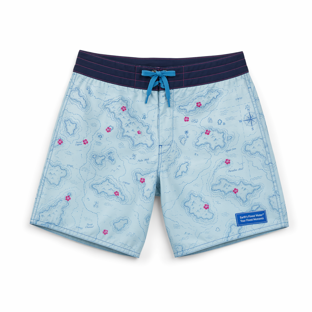 Photorealistic overhead product image of FIJI ‘hidden island map’ boardshorts, strictly using the silhouette for shape and cut. Fabric: soft-touch, matte recycled microfiber, breathable and quick dry. Base color is light lagoon blue (#BBDDE6). Over this sits a faint, almost hand-drawn line-art map pattern in slightly darker blue (#003DA5) depicting abstract island outlines, currents, and coordinates; small magenta hibiscus icons (#E10098) mark ‘secret spots’ scattered across both legs. At the lower right leg, a small rectangular patch in FIJI blue with white text reads ‘Earth’s Finest Water® / Your Finest Moments’ in two lines, lending a collectible capsule feel. Waistband is navy with contrasting magenta stitching around the top edge and a FIJI blue flat drawcord. Shot on a clean white background, even, soft studio light from above with mild directional shading to showcase the map lines and texture of the fabric. Camera top-down, product centered, enough negative space to feel relaxed and airy, emphasizing approachable luxury and escapist storytelling.