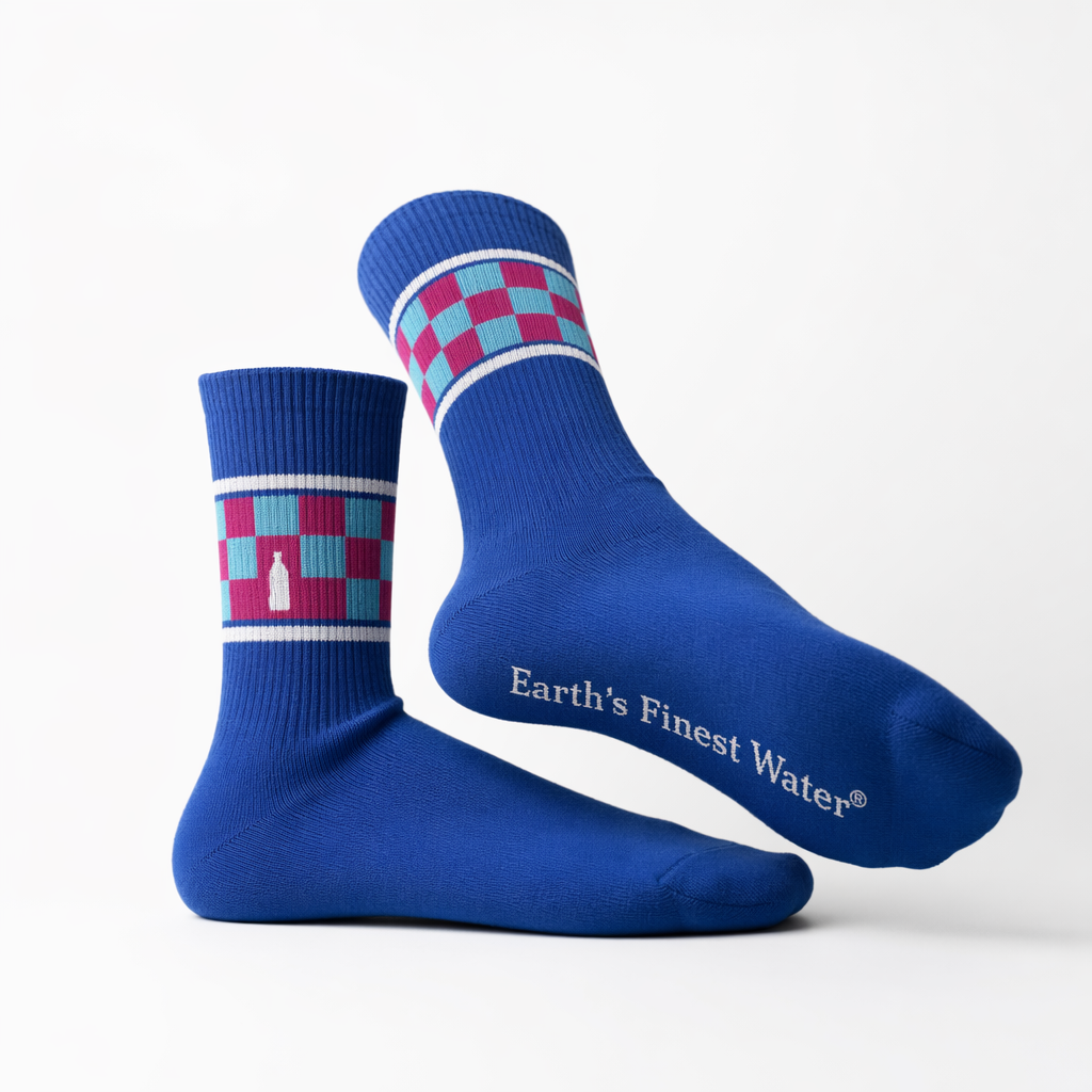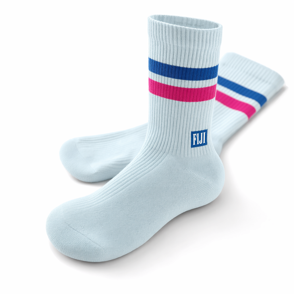 High-end yet playful FIJI “Checker Escape” sock render using silhouette 10_808-racing-stripes-federal-blue-bone.jpg. Display on a bright white tabletop-style background with gentle natural-feeling softbox light coming from the upper left, casting a soft diagonal shadow. The sock base is FIJI blue (PMS 293) with a fine ribbed leg and smooth foot. Around the ankle area, wrap a bold but compact checker band: alternating small squares of hibiscus magenta (#E10098) and light blue (PMS 3115 C), bordered above and below by thin white lines, like a bracelet around the leg. Inside one of the magenta squares on the outer side, place a micro white icon of the FIJI bottle silhouette, no text. On the bottom of the foot arch, knit “Earth’s Finest Water®” in white, slightly curved to follow the arch shape, visible because the sock is posed with one foot rotated to show the sole. Camera: two-sock composition, one lying flat, the other propped up against it at an angle to showcase both the side checker band and the underside text. Mood: iconic and fun, an everyday ritual piece that feels like something you’d style with sneakers and shorts in a laid-back, well-traveled fit, very shareable on Gen Z social feeds.