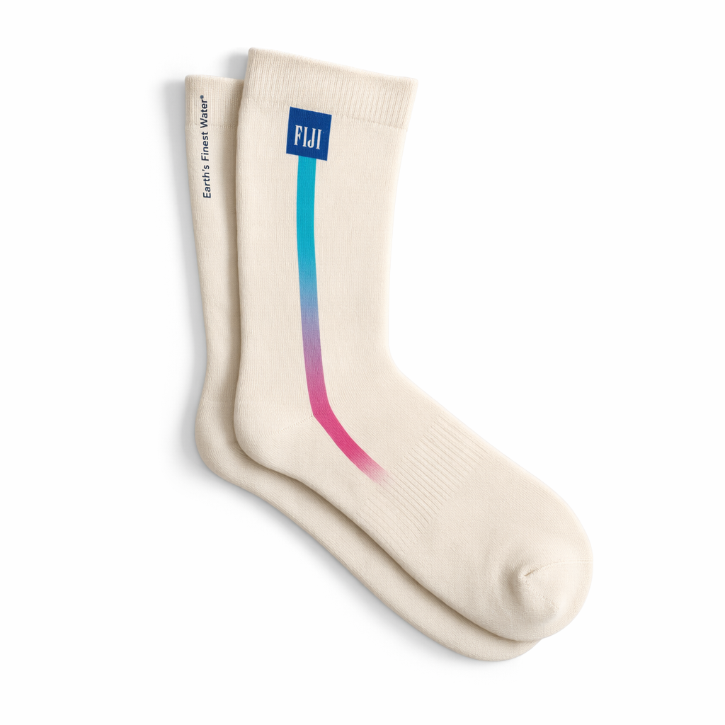 Photorealistic mockup of a FIJI Water Gen Z fashion sock using silhouette 10_808-racing-stripes-federal-blue-bone.jpg as the exact form. Displayed on a pure white cyclorama background for a crisp e‑commerce feel. The sock body is a creamy off‑white cotton with a very fine, smooth knit, signaling premium quality. Running vertically down the outer side from cuff to just above the toe, integrate a minimalist “island escape” stripe graphic: a square FIJI-blue bar (PMS 293) at the cuff referencing the bottle shape, followed by a thin gradient stripe that softly shifts from bright light blue (PMS 3115 C #00C1D5) to hibiscus magenta (#E10098) toward the ankle, as if water deepens into sunset. Within the FIJI-blue square, place a small white FIJI logotype. Along the back of the cuff, in tiny, tonal navy (PMS 296 #041C2C) text, knit “Earth’s Finest Water®” vertically as a secret detail only visible from behind. Lighting: high-key, even studio lighting with subtle soft shadows under and behind the socks to ground them, no harsh reflections. Camera: overhead top-down shot of a pair of socks carefully arranged in a relaxed, slightly overlapping layout, toes pointing in the same direction, to feel curated but not fussy. Overall vibe: cool, travel-inspired, subtly expressive — a personal ritual item that dresses up everyday sneakers without feeling like a billboard.