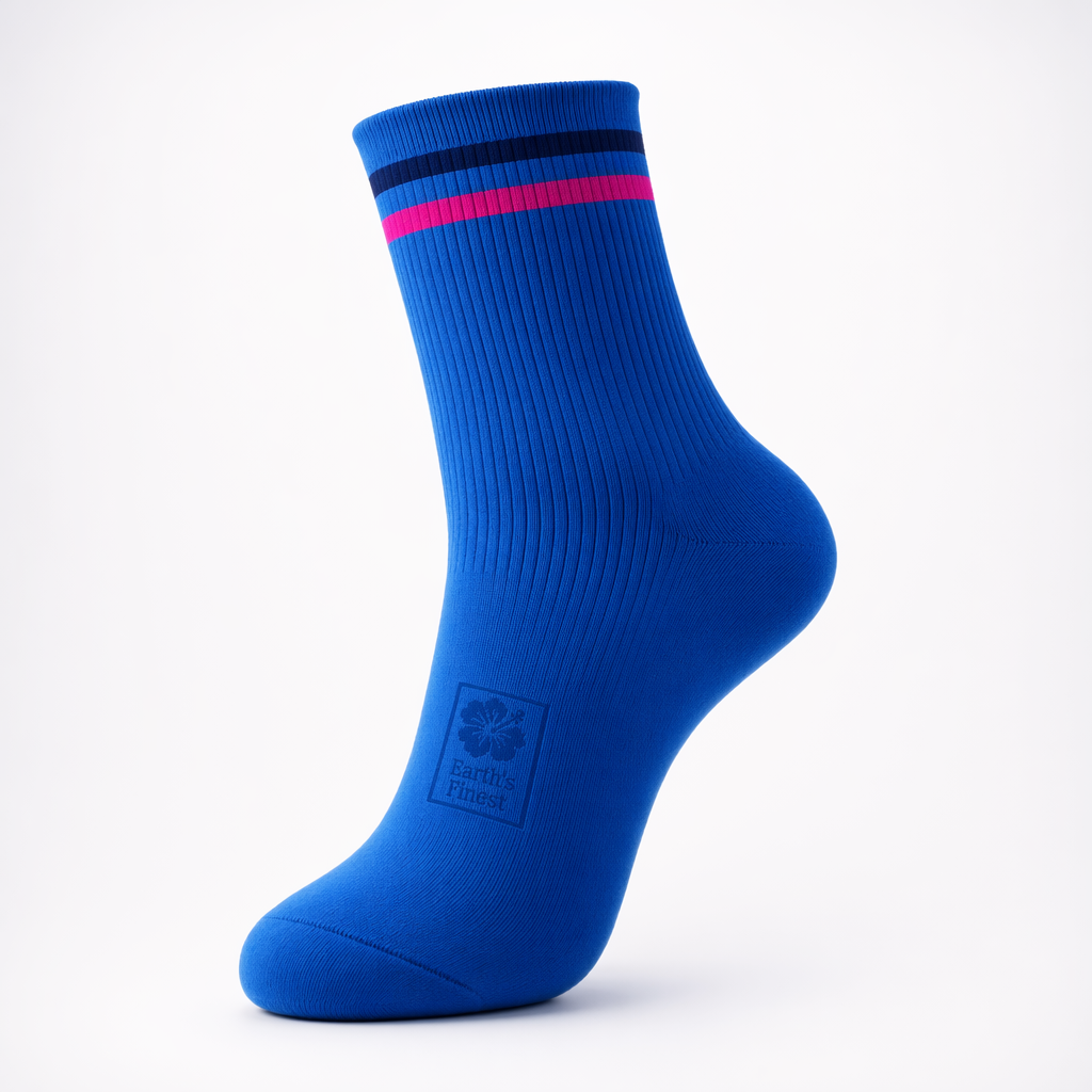 Ultra-clean studio render of FIJI Water–inspired sporty lounge socks for Gen Z, using the exact silhouette from 10_808-racing-stripes-federal-blue-bone.jpg. Set against a bright white gradient background fading softly to near-white at the edges for a modern look. Sock body: saturated FIJI electric blue (between PMS 293 and PMS 3115 C) with visible ribbing along the leg. Around the cuff, add three slim horizontal stripes: navy (PMS 296), FIJI blue (PMS 293), and hibiscus magenta (PMS Rhod. #E10098) for a stacked, playful accent. On the top of the foot, place a small, tonal, debossed-style square icon in a slightly darker blue, containing a tiny hibiscus outline and the words “Earth’s Finest” in micro text, all woven not printed, to feel subtle and premium. Avoid any sports-performance cues; styling reads as cozy athleisure, not hardcore training. Lighting: soft, slightly cool studio light from both sides to highlight the knit and color saturation, with crisp but soft-edged shadows under the arch and heel. Camera: three-quarter side view of a single sock on an invisible foot form, toes slightly pointing down, so the cuff stripes and top-of-foot branding are clearly visible. Mood: confident, playful, and relaxed — the kind of sock you wear after the beach or to a casual brunch, liquid-luxury energy without flexing.