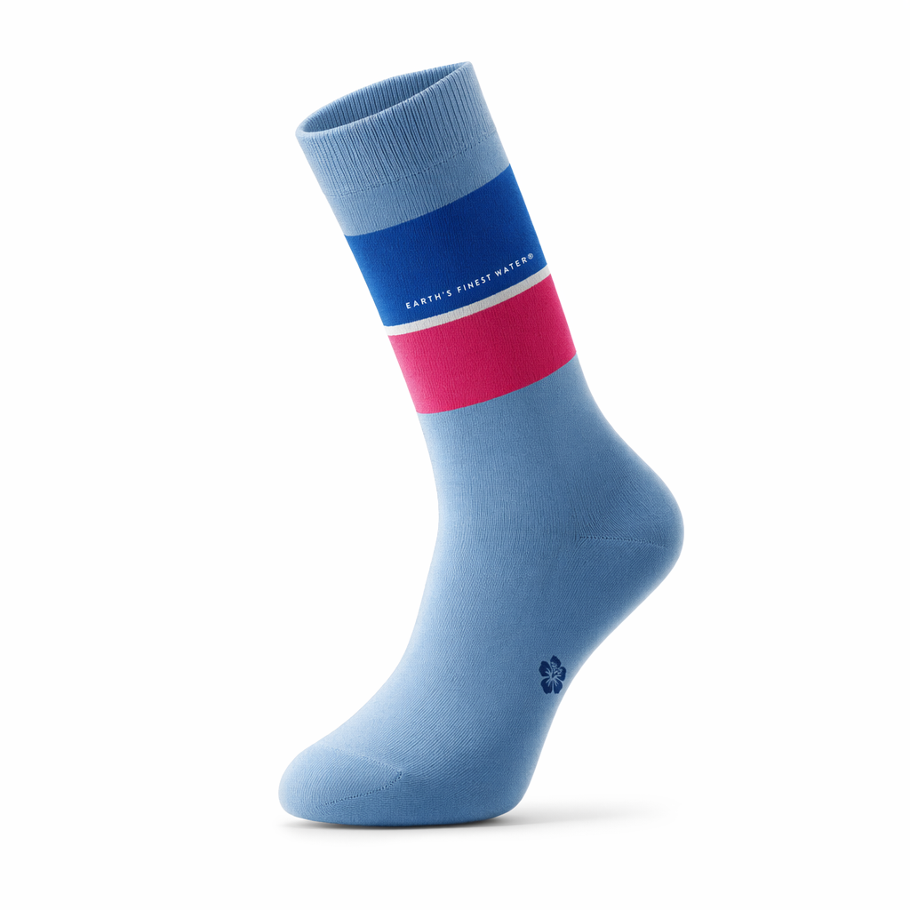 Photorealistic lifestyle-ready product shot of a FIJI “sunset ritual” sock, using silhouette 10_808-racing-stripes-federal-blue-bone.jpg. On a pure white seamless background, the sock body is a silky light blue (PMS 7457 C) cotton-modal blend with a very smooth, almost satin-like finish for an affordable-luxury feel. Around the mid-calf, create two wide horizontal bands: the upper band in FIJI blue (PMS 293 #003DA5), the lower in hibiscus magenta (#E10098), separated by a thin white line, evoking horizon and sun at dusk. Between the bands, in very small white capital letters, knit “Earth’s Finest Water®” only on the outer leg, forming a hidden narrative detail. On the side of the foot arch, add a tiny navy hibiscus emblem. Lighting: bright, balanced studio light from above with slight front fill, giving a gentle sheen to the fibers and soft, short shadows that feel airy. Camera: 45-degree angle side view of a single sock gently bent at the ankle, floating slightly above a faint shadow, to feel effortless and fashion-y but still simple. Overall mood: escapist and calm — a sock that turns slipping off your shoes into a small daily ritual.