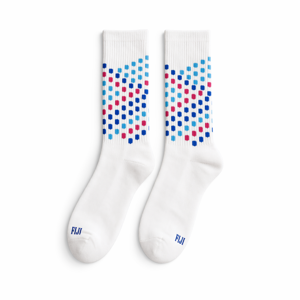 High-resolution flat-lay render of FIJI Water “square wave” pattern socks, using 10_808-racing-stripes-federal-blue-bone.jpg for proportion and structure. Place the pair neatly side by side on a solid white background with very soft studio shadows. The base color is crisp white cotton with a fine rib knit. Starting slightly below the cuff and ending above the ankle, decorate the leg with a repeating tiled pattern of small squares inspired by the FIJI bottle shape: alternating squares of FIJI blue (PMS 293), bright light blue (PMS 3115 C), and hibiscus magenta (PMS Rhod.), arranged in a loose wave that curves subtly as it travels down the leg, suggesting flowing water. Keep the pattern scale small to feel modern and wearable, not loud. At the toe, embroider a tiny FIJI wordmark in FIJI blue on the outer side only. Lighting: overhead diffused lighting, nearly shadowless, capturing the texture of the knit, color accuracy, and minimal wrinkles. Camera: top-down, straight-on composition with plenty of white space around the socks, echoing a premium lookbook or product grid shot that Gen Z would screenshot or pin. Vibe: playful pattern, fashion lens on an everyday object, clearly FIJI but not logo-heavy.