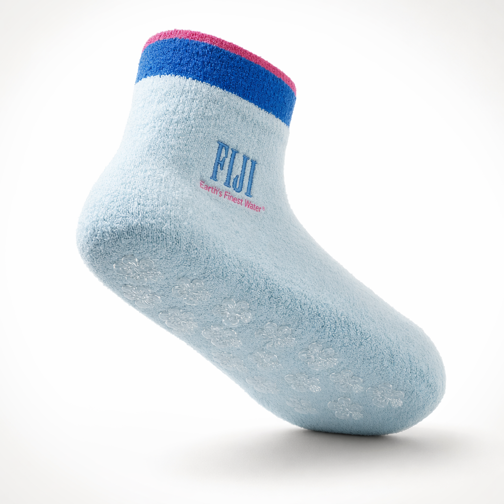 Photorealistic studio image of a FIJI “Hotel Slipper Sock” concept for Gen Z, shaped exactly like 10_808-racing-stripes-federal-blue-bone.jpg but styled as a plush lounge sock. Background: pure white with a slight vignette toward the edges. The sock fabric is a thick, ultra-soft terry knit in pale ice blue (PMS 7457 C #BBDDE6), with visible fuzzy loops, emphasizing comfort and relaxation. Around the cuff, instead of typical stripes, knit a wide band in FIJI blue (PMS 293) with a narrow magenta (PMS Rhod.) accent line at the top edge, giving a subtle pop. On the outer ankle, embroider a small, tonal FIJI logo in slightly darker blue, and beneath it, in very small magenta stitching, the phrase “Earth’s Finest Water®” — legible but discreet. The sole area features a pattern of tiny, transparent silicone hibiscus icons as anti-slip grips, visible because the sock is gently rotated to show the bottom. Lighting: soft, cozy studio light with warm-neutral temperature, clear shadow beneath the heel and toe to ground the sock. Camera: three-quarter underside angle so viewers can see the plush texture, cuff band, and grip pattern, evoking the feeling of checking into a boutique island hotel. Mood: laid-back, pampering, everyday spa-at-home ritual.