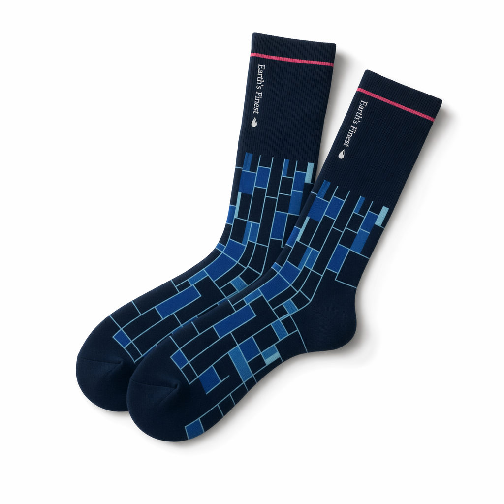 Clean, editorial-style mockup of FIJI “Pool Tile” graphic socks using the 10_808-racing-stripes-federal-blue-bone.jpg silhouette. Background is bright white, shot like a minimalist fashion catalog. Sock body: deep navy (PMS 296 #041C2C) cotton with a tight, smooth knit. Across the top of the foot and wrapping slightly up the sides, render a subtle, geometric pattern of interlocking rectangles in FIJI blue (PMS 293) and light blue (PMS 3115 C), mimicking the look of tiled water surfaces. At the cuff, a single thin magenta stripe (PMS Rhod.) runs around the entire circumference as a crisp accent, tying into the FIJI palette without overpowering. Near the outer cuff, place a small vertical wordmark “Earth’s Finest” in white, with a tiny water droplet icon under the text. Lighting: highly diffused, directional light from the right, creating soft gradient highlights along the navy surface and precise but delicate shadows on the white ground. Camera: diagonal flat-lay with the socks arranged in a subtle S-curve, toe of one sock overlapping the other slightly, to feel effortless and Instagram-ready. Vibe: cool, confident, slightly architectural — an everyday sock that feels like a design object.