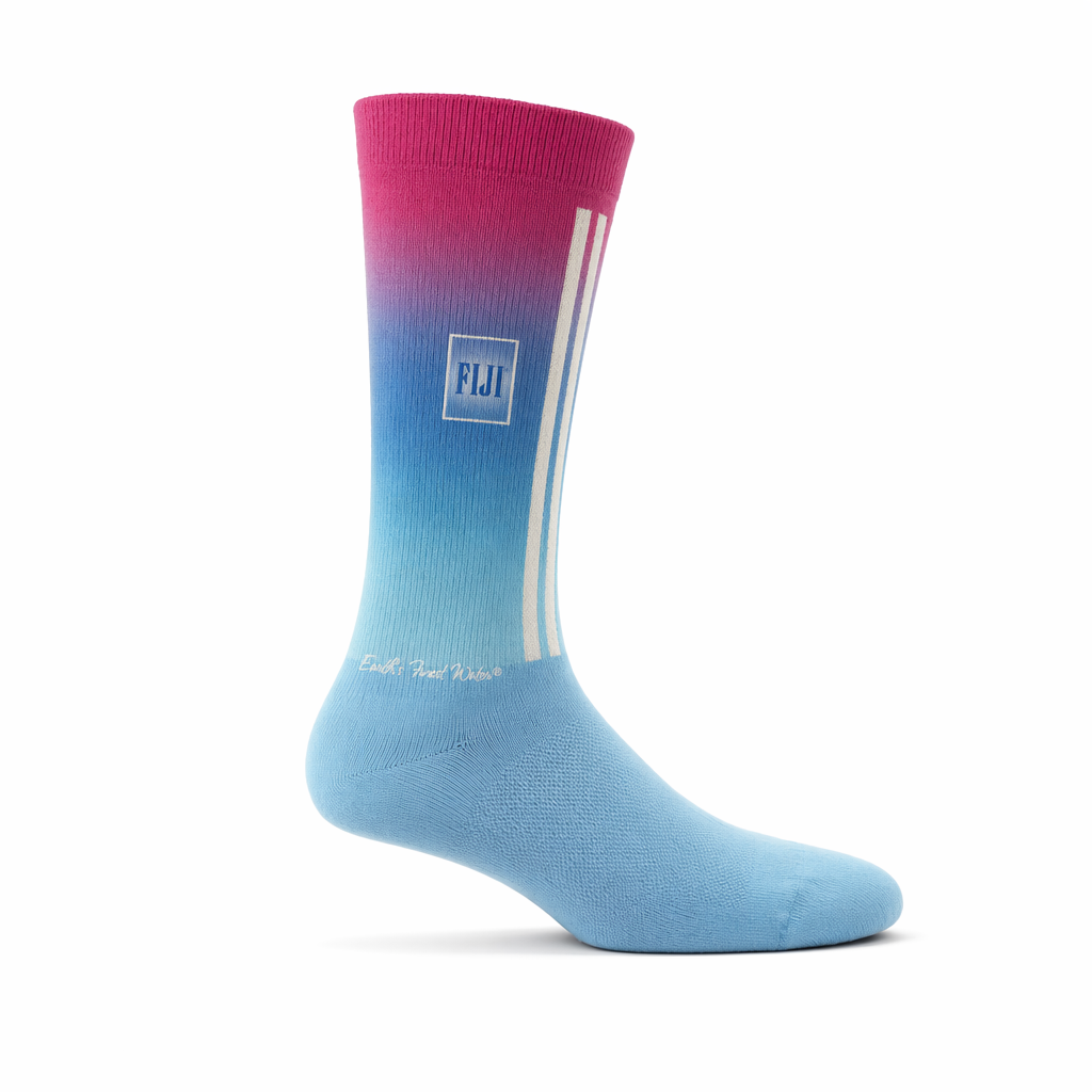 Photorealistic product shot of a FIJI “Island Gradient” sock collection hero, using 10_808-racing-stripes-federal-blue-bone.jpg as the silhouette. On a clean white background, feature a single hero sock front-and-center with a very gentle pastel gradient knit into the leg: starting at the cuff in hibiscus magenta (PMS Rhod.), smoothly fading into FIJI blue (PMS 293), then into bright light blue (PMS 3115 C) as it approaches the ankle, while the foot remains solid light blue (PMS 7457 C). The gradient should appear woven, not printed, with visible stitch transitions. On the outer side of the leg, near mid-calf, embed a small white square outline referencing the FIJI bottle label shape, with a minimal “FIJI” inside in FIJI blue. At the bottom of the gradient, just above the ankle, knit the phrase “Earth’s Finest Water®” in tiny white script that blends into the transition. Lighting: bright and neutral-white, with slight front fill to make the gradient colors pop yet keep them soft; crisp shadows directly beneath the sock. Camera: straight-on side view with a slight top-down tilt to see the gradient and label square clearly. Mood: dreamy, escapist, TikTok-friendly color story that still feels wearable as an everyday luxury sock.