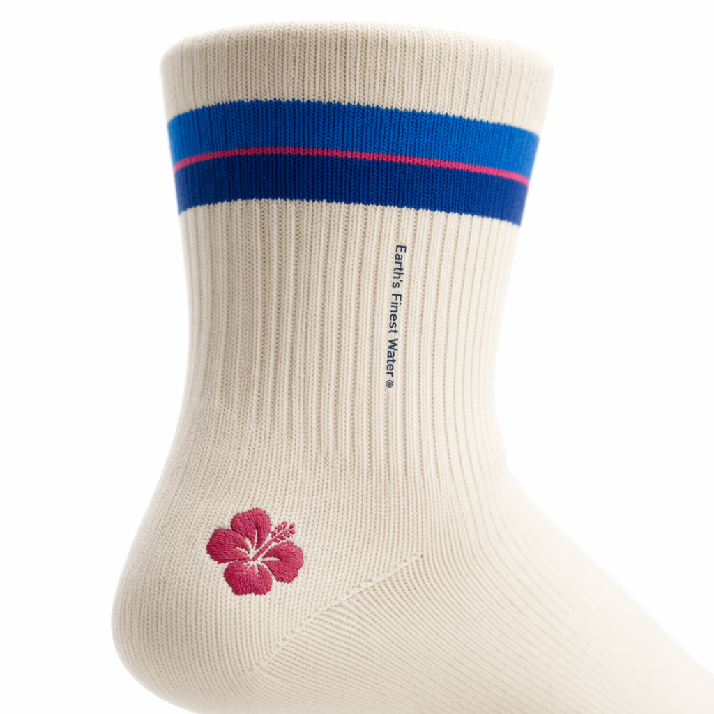 Minimalist close-up render of FIJI “Cap Stripe” socks, shaped exactly like 10_808-racing-stripes-federal-blue-bone.jpg, on a pure white background. The sock body is soft heathered bone/cream to nod to the original silhouette filename while staying premium. Around the cuff, add two medium-width horizontal bands in cap blue (PMS 300 C #005EB8) and FIJI blue (PMS 293 #003DA5), with a very thin magenta (PMS Rhod.) pinstripe running between them as a precise detail. On the outer calf, vertically along the ribbing, knit “Earth’s Finest Water®” in tiny navy (PMS 296) microtype, tucked between ribs so it’s visible only up close — like a secret tagline. At the outer ankle, embroider a small, flat hibiscus icon in magenta. Lighting: macro-style studio lighting, bright and soft, emphasizing the rib knit, stitching, and embroidery with shallow depth of field; background remains pure white and out of focus. Camera: very close side view, focusing on the cuff and upper ankle area, with the rest of the sock softly blurred, feeling like a detail shot from a premium streetwear drop. Mood: fashion-forward, subtle flex, “if you know you know” branding for Gen Z tastemakers.