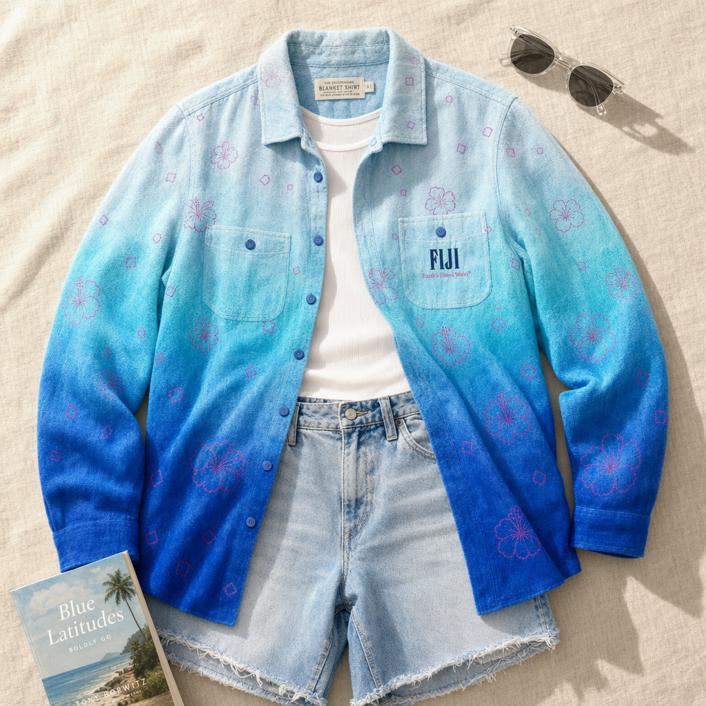 Photorealistic studio mockup of a unisex, Gen Z–focused FIJI Water camp-collar blanket shirt, using the provided silhouette 01_blanket-shirt-outerworn.jpg as the exact shape and proportions. The shirt is made from a soft, midweight brushed cotton blend that feels like a beach blanket, with a slightly oversized, relaxed fit. All-over pattern: an abstract, wavy gradient that echoes FIJI bottle water and island lagoons, flowing from deep FIJI blue (#003DA5) at the hem through bright light blue (#00C1D5) toward a pale ice blue (#BBDDE6) at the shoulders. Scattered across the gradient are small, playful hibiscus line-drawings and square motifs in hibiscus magenta (#E10098), referencing FIJI’s label art and bottle shape without looking like a logo dump. On the left chest pocket, a small, tonal FIJI wordmark in navy (#041C2C) sits above the subtle campaign line “Earth’s Finest Water®” in tiny magenta type, clean and premium. Buttons are matte cap-blue plastic that match PMS 300 C, with slightly rounded edges for a soft, casual feel. The shirt is styled half-buttoned over a plain white ribbed tank top and loose, light-wash denim shorts, laid out flat on a textured sand-colored linen surface, with a pair of minimalist clear-framed sunglasses and a paperback book nearby to communicate relaxation and escape. Lighting is bright, soft daylight from above-left, with gentle shadows and slight specular highlights on the buttons and fabric weave to showcase quality. Camera framing is top-down, slightly off-center, showing the full silhouette of the shirt and some negative space around it for a calm, editorial feel. Background is clean and uncluttered, color palette strictly FIJI blues plus magenta accents, no other strong colors, no visible brand logos besides FIJI.