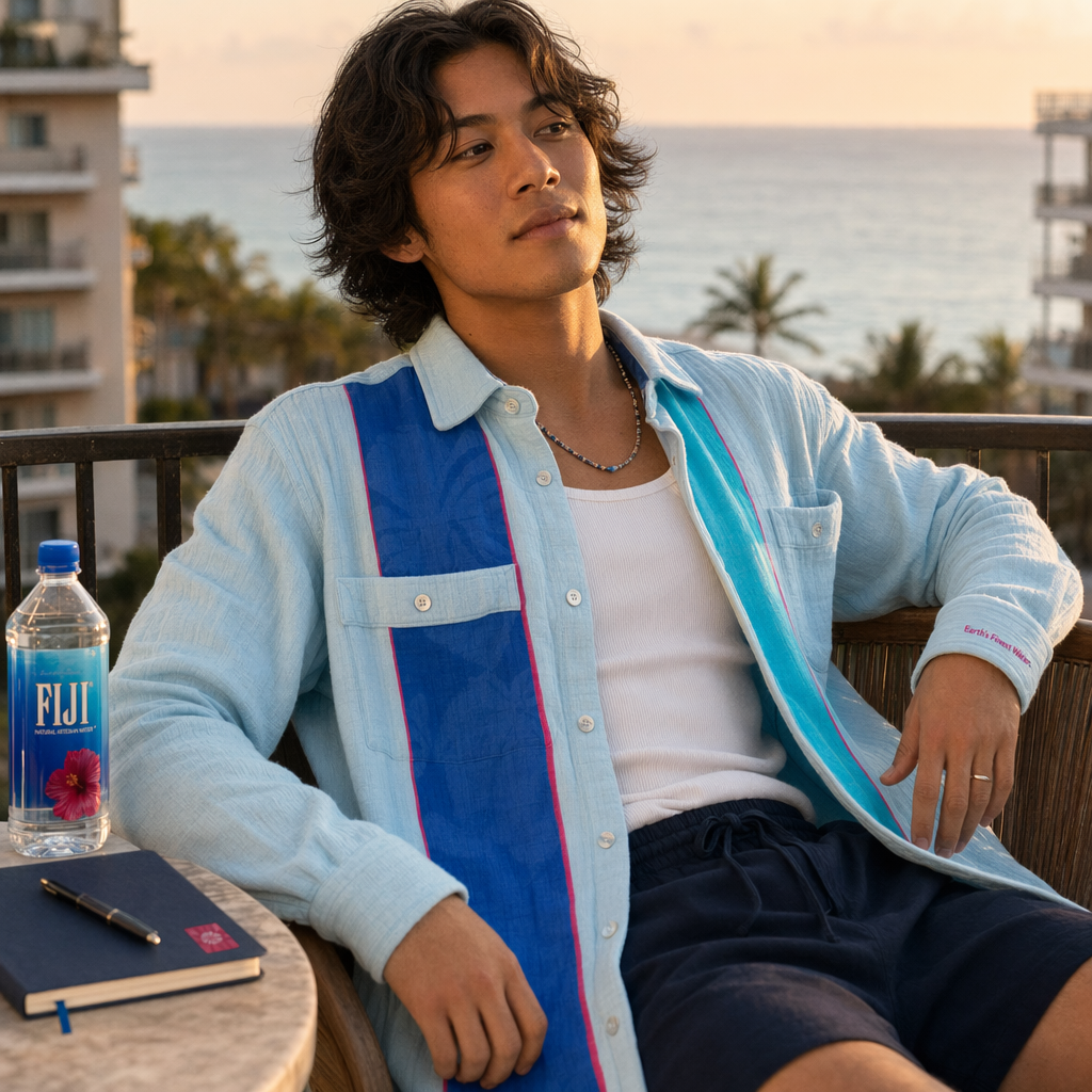 Photorealistic lifestyle mockup of a gender-neutral FIJI Water blanket shirt for Gen Z, using the provided silhouette 01_blanket-shirt-outerworn.jpg exactly for cut and drape. The shirt is a double-gauze cotton with a soft, cozy, beach-towel texture, slightly crinkled and ultra-relaxed. Base color is a soft light blue (#BBDDE6) with bold, vertical color-blocked panels: one panel in primary FIJI blue (#003DA5), another in bright light blue (#00C1D5), separated by slim magenta (#E10098) pinstripes that run from collar to hem. Inside the FIJI blue panel, a subtle, oversized tonal hibiscus shadow-print fades in and out, visible only in the light. The back yoke features a small, embroidered square icon in FIJI blue with a tiny magenta hibiscus at its center, a quiet nod to the iconic bottle. On the left cuff placket, in tiny, clean sans-serif type, is embroidered “Earth’s Finest Water®” in magenta as a hidden detail, almost like a secret message. Buttons are natural shell with a pale blue tint, slightly iridescent for an affordable-luxury feel. The shirt is worn open over a simple ribbed tank and relaxed drawstring shorts in navy (#041C2C), on a casually seated Gen Z model, mid-20s, well-traveled, laid-back, no overt fitness vibe. Scene: golden-hour balcony of a beachside apartment, soft ocean blur in the far background, a FIJI bottle resting on a low table next to a journal and pen, capturing an everyday ritual of unwinding. Lighting: warm, low sun with soft shadows and a gentle rim light along the shirt shoulder seams, highlighting the fabric depth and color blocks. Camera: 3/4 view from waist up, slightly above eye-level, shallow depth of field so the shirt details and embroidery are sharp while background is softly out of focus. Overall mood: effortless, cool, aspirational but attainable, rooted in FIJI’s blue + magenta signature with no extra competing colors.