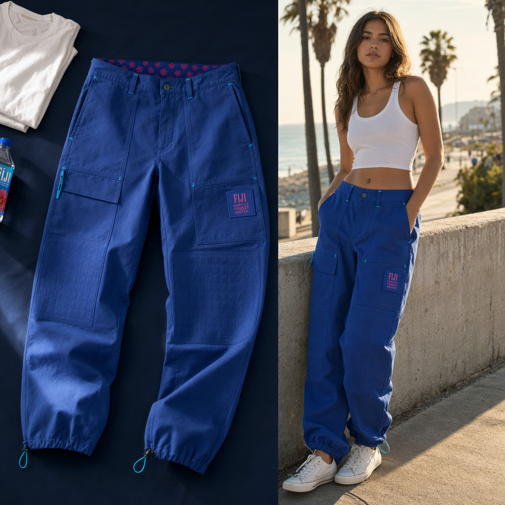 Photorealistic apparel flat-lay and on-body mockup of FIJI Water “Gen Z escape” unisex utility pants, using the provided silhouette image 02_westbound-utility-pants-outerworn.jpg as the exact shape and pattern block. Midweight premium cotton-nylon blend with a soft, slightly crisp handfeel, designed as affordable luxury loungewear you can wear from couch to coastline. Base color is FIJI primary blue (#003DA5) with subtle tonal square quilting panels on knees that quietly nod to the FIJI bottle shape. Oversized cargo pockets are clean and minimal, with laser-cut rubberized patch on the left pocket in FIJI blue and hibiscus magenta (#E10098) showing a tiny square “Earth’s Finest Water®” lockup. Contrast bartacks and zipper pulls in bright light blue (#00C1D5). Interior waistband printed with a repeating micro hibiscus pattern in magenta for a personal, hidden detail. Fit is relaxed, slightly high-waisted, straight leg with adjustable bungee cord and stoppers at the hem so they can cinch above the ankle or pool over sneakers. Show two angles: 1) flat-lay on a soft navy (#041C2C) backdrop with gentle natural daylight from the left, a folded white tee and FIJI bottle just peeking in the corner to suggest an everyday ritual; soft shadows, no harsh reflections. 2) street-style on a Gen Z model leaning casually against a low wall near a sunlit coastal boardwalk, shot at 35mm eye-level, late-afternoon golden hour with a relaxed, laid-back mood. Styling is simple: cropped tank, minimal sneakers, no flashy jewelry. Overall vibe: iconic, effortless, playful, but not ostentatious, clearly rooted in FIJI’s color pairing of blue and magenta.