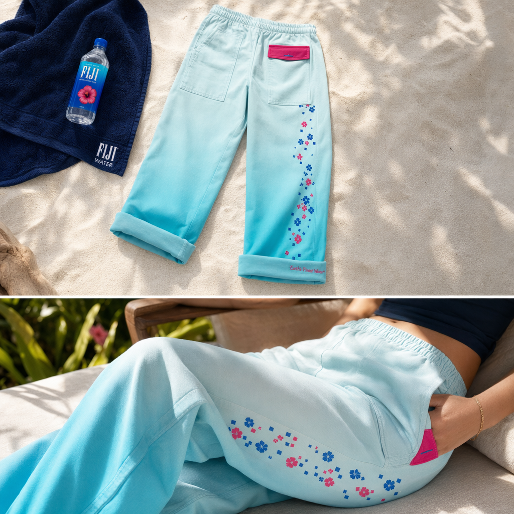 Photorealistic mockup of FIJI Water “Island Lounge Utility Pants” for Gen Z, using the exact silhouette from 02_westbound-utility-pants-outerworn.jpg as the garment shape. Fabric is a premium, fluid TENCEL-blend twill with a matte finish, draping softly to reinforce relaxation and escape. The base color is a gradient effect that runs very subtly from light FIJI ice blue (#BBDDE6) at the waistband to bright light blue (#00C1D5) at the hem, inspired by looking into a FIJI bottle. Large utility pockets keep a clean, almost tech-minimal profile, with one pocket flap lined in hibiscus magenta (#E10098) so the magenta is visible only when flipped up, making it personal and inward. On the right leg, a vertical, small-scale tonal print of abstract hibiscus petals and tiny squares in FIJI blue (#003DA5) and magenta feels like a modern fashion pattern, not loud branding. A tiny embroidered “Earth’s Finest Water®” in magenta sits low near the back cuff, almost like a secret signature. Include a soft elastic waistband with hidden drawcord in cap blue (#005EB8), no noisy metal hardware. Scene 1: laid on a white-sand textured surface with a navy (#041C2C) towel and a FIJI bottle nearby, overhead shot in soft diffused daylight, gentle shadows, evoking a beach-adjacent ritual without showing full ocean. Scene 2: close-up 50mm crop of the thigh and pocket area on a seated model on a cushioned outdoor lounge chair, surrounded by blurred tropical greenery bokeh, backlit with warm late-afternoon sun to create a relaxed vacation-at-home feeling. The pants must look premium yet approachable, with a fashion-forward Gen Z lens and clear blue + magenta FIJI cues.