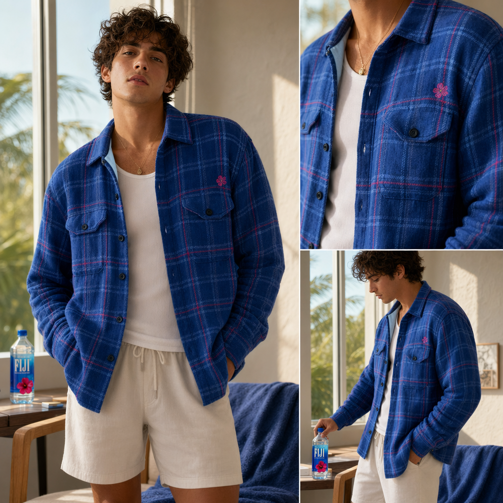 Photorealistic product mockup of a FIJI Water Gen Z–focused unisex blanket-shirt jacket using the provided silhouette 03_blanket-shirt-outerworn.jpg as the exact garment shape. The shirt is slightly oversized with soft dropped shoulders, a relaxed collar, and large front pockets, styled as an elevated beach-to-city layer. Material: ultra-soft brushed organic cotton flannel with a cashmere-like hand feel, medium weight, clearly cozy but not bulky. Main color: rich FIJI primary blue (#003DA5) in a subtle tonal plaid, with thin hibiscus magenta (#E10098) pinstripes woven through the pattern for the signature blue + magenta pairing. Inner neck yoke and inside of the placket lined in light ice blue (#BBDDE6) for a hidden “personal ritual” detail. Embellishment: small, woven FIJI square-label tag at the left hip seam in FIJI blue with white logo, and a minimal embroidered hibiscus icon in magenta on the left chest near the pocket—no large logos, feels fashion-first, not merch-y. Buttons: matte navy (#041C2C) biodegradable corozo buttons with a subtle sheen. Styling: worn open over a white ribbed tank and soft shorts, suggesting an everyday ritual moment after the beach or at home. Setting: airy, sunlit apartment with tall windows, a hint of palm leaves outside, and soft shadows, evoking relaxation and escape rather than performance or nightlife. Background palette: muted off-white walls with slight warm tone, a low light-wood chair, and a folded FIJI-blue throw on the side to echo the color story. Lighting: natural late-afternoon window light, slightly directional from the side, casting gentle shadows and giving the fabric visible depth and texture. Camera framing: primary shot is mid-torso to mid-thigh, straight-on, hero-ing the silhouette and pattern; secondary angle slightly off to the side and closer, focusing on the chest embroidery and button placket. Mood: laid-back, effortlessly cool, affordable luxury for an everyday unwinding ritual—something a well-traveled Gen Z creative throws on after a shower, journaling, or scrolling on the couch with a FIJI bottle nearby.