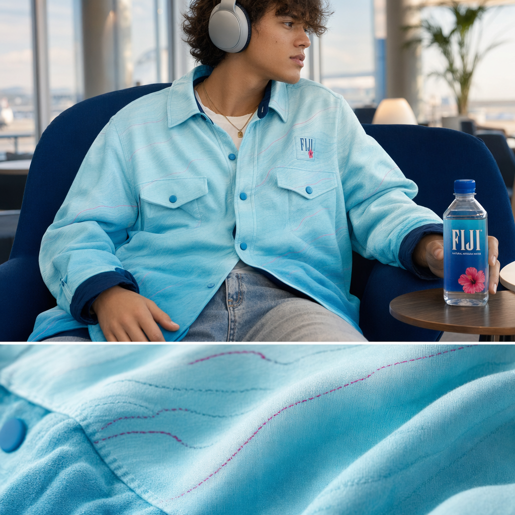 Photorealistic mockup of a FIJI Water Gen Z–focused unisex blanket-shirt jacket using the silhouette 03_blanket-shirt-outerworn.jpg as the exact cut and drape. The piece feels like a travel comfort shirt—half shirt, half blanket—designed for “Your Finest Moments” of escape: long flights, study sessions, slow weekends. Material: premium TENCEL blend with a smooth, slightly silky surface and gentle drape, lined at the inside back panel with ultra-soft brushed jersey for extra coziness against the skin. Base color: light aqua / bright light blue (#00C1D5 and #BBDDE6 in a soft vertical gradient wash, like subtle watercolor, moving from deeper blue near the hem to lighter near the collar). Overlaid pattern: very minimal, almost tonal wave motifs inspired by Pacific water ripples, with fine magenta (#E10098) accents tracing a few curves—delicate, not loud. Branding: on the left chest, a small tonal FIJI square patch with a micro-print of the iconic bottle label colors, but simplified and matte; under the back collar, a tiny line of text in white reading “Earth’s Finest Water®” in a refined sans serif, only visible up close. Cuffs and inner placket lined in navy (#041C2C) for a subtle contrast when sleeves are rolled. Buttons: low-profile matte FIJI-blue snaps for a modern, gender-neutral, utilitarian feel. Context: styled draped over the back of a plush FIJI-blue airplane seat or lounge chair in an airport club, with a Gen Z traveler half in frame—wireless headphones, simple gold jewelry, no logos—sipping FIJI from the iconic square bottle resting on a side table. Background: softly blurred, premium yet approachable airport lounge with warm neutral tones, a hint of tropical plant in the background, no visible brand clutter. Lighting: cool, diffused daylight from large windows, with soft highlights along the fabric folds and gradient, suggesting early-morning or golden-hour travel. Camera framing: three-quarter view from waist up, slightly angled to showcase the gradient, wave details, and back-collar text, plus an inset closeup macro shot of the fabric texture and magenta wave stitching. Overall mood: chill, well-traveled, emotionally rich but understated, the kind of piece that feels like a personal ritual object Gen Z reaches for on flights or late-night study sessions—trendy yet timeless, clearly something only FIJI would design.