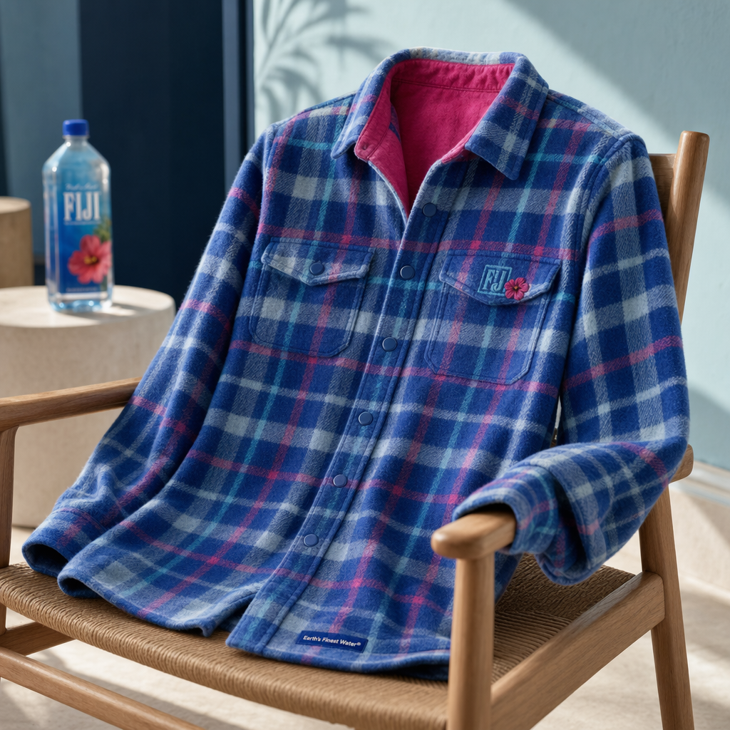 Photorealistic mockup of a Gen Z-focused FIJI Water unisex blanket-shirt jacket, using the provided silhouette image 04_blanket-shirt-outerworn.jpg as the exact garment shape and drape. The fabric is a plush but lightweight brushed cotton flannel with a soft, cozy handfeel, positioned as affordable luxury for everyday lounging and travel. Main body in FIJI primary blue (#003DA5) with an oversized, relaxed check pattern that blends FIJI blue, light blue (#BBDDE6), bright light blue (#00C1D5), and hibiscus magenta (#E10098). The checks are slightly irregular and playful, inspired by island sunsets and water reflections. Inside of the blanket-shirt features a contrasting hibiscus magenta brushed lining at the collar stand and inner placket for a subtle pop when worn open. Front chest pocket on the left carries a small, tonal embroidered FIJI square icon and hibiscus flower mark in light blue and magenta, minimal and premium, with no large logo lockups. At the lower front hem, a tiny woven label reads “Earth’s Finest Water®” in white on FIJI blue, stitched cleanly for a fashion-forward detail. Matte tonal blue snap buttons down the front for ease, no shine or chrome. The overall vibe is laid-back, cool, and well-traveled, meant to be thrown over a tee after the beach or on a plane. Shot in a sunlit, minimal interior scene: the blanket-shirt styled on a simple natural-wood chair next to a low, white plaster side table, with a FIJI bottle casually placed in the background out of focus to hint at the brand without dominating. Background palette in soft navy (#041C2C) shadows and light blue walls (#BBDDE6) to harmonize with the garment. Soft, natural daylight from a side window creates gentle shadows and emphasizes the fabric texture and softness. Camera: 3/4 frontal view at mid-chest height, medium close-up framing that clearly shows the check pattern, pocket embroidery, woven label, and plush texture, with shallow depth of field to keep the focus on the garment while the room softly blurs.