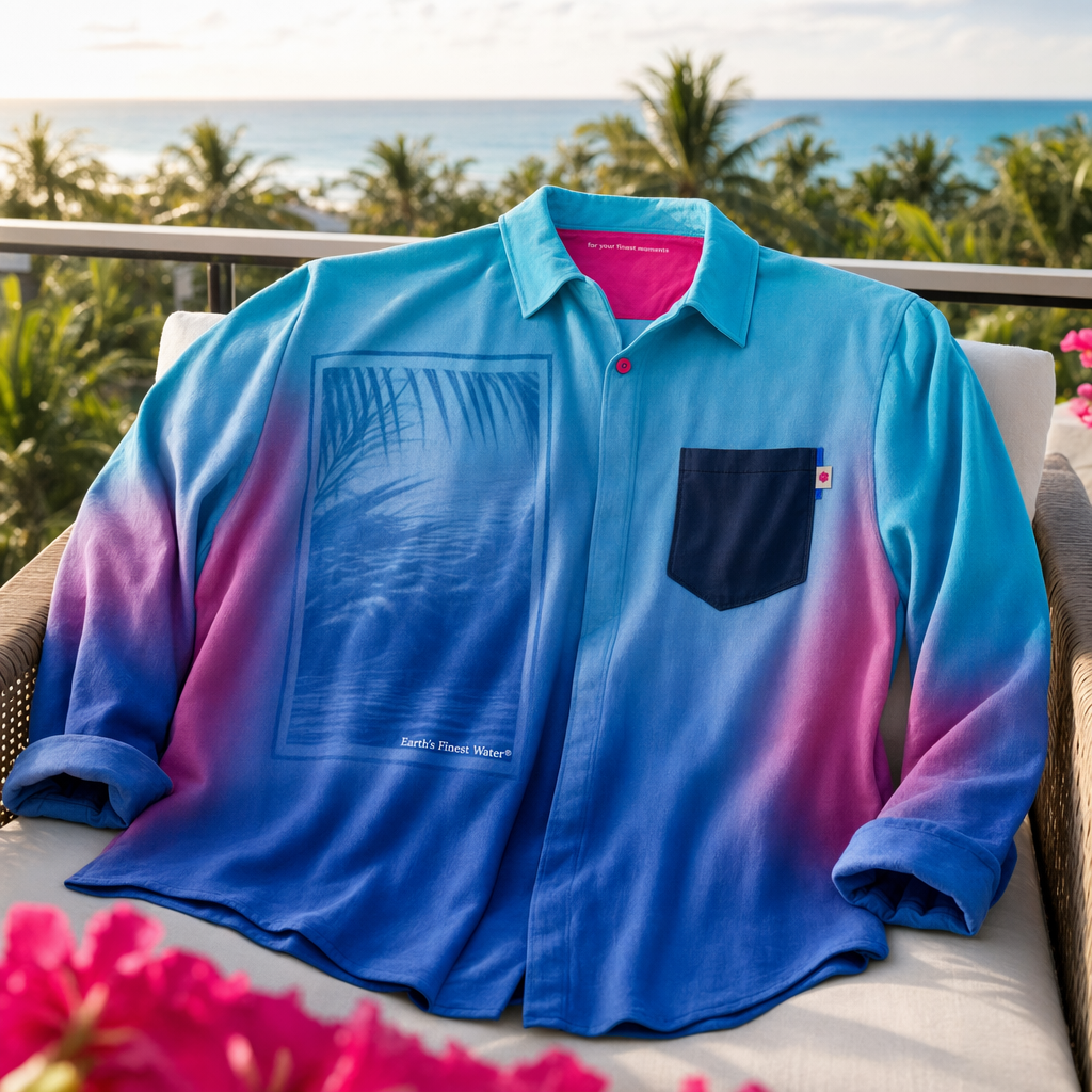 Photorealistic mockup of a FIJI Water Gen Z-targeted blanket-shirt hybrid using the silhouette image 04_blanket-shirt-outerworn.jpg as the exact shape, presented as an elevated, travel-ready “escape” layer. The garment is made from a smooth, sand-washed cotton-rayon blend that looks silky but remains casual and breathable. Overall color is a soft gradient field that runs vertically from bright light blue (#00C1D5) at the shoulders to primary FIJI blue (#003DA5) at the hem, with subtle hibiscus magenta (#E10098) misting along the side panels, evoking a tropical dusk over the ocean. Across the back panel, printed in a slightly ghosted, tonal treatment, is an oversized square FIJI “window” graphic framing abstract, blurred palm fronds and water ripples; within the lower corner of this square, small crisp type reads “Earth’s Finest Water®” in white. Front is cleaner: a single chest pocket in solid navy (#041C2C) with a micro woven label at the pocket edge showing the FIJI hibiscus icon and cap blue edge detail, like a fashion brand tag rather than merch. Buttons are hidden under a clean placket; top button only is exposed and finished in hibiscus magenta for a playful Gen Z accent. Interior yoke in bold magenta with a printed line of copy reading “for your finest moments” in tiny white type, visible only when the collar flips—personal and inward. Styling and context: the blanket-shirt draped half-open over a white linen lounge chair on a balcony overlooking soft-focus tropical greenery and a hint of ocean horizon, giving a relaxed escape vibe, not a party scene. Early golden-hour light creates warm highlights on the fabric and a gentle glow on the gradient, suggesting wind-down time after a day at the beach. Background is predominantly soft blues with touches of magenta in nearby hibiscus flowers in a blurred foreground, reinforcing the brand colors. Camera: slightly above waist level, angled so the viewer sees both front and a portion of the back gradient and square graphic, medium shot with shallow depth of field, crisp focus on fabric drape, gradient, and pocket details while background bokeh keeps the mood dreamy and aspirational.