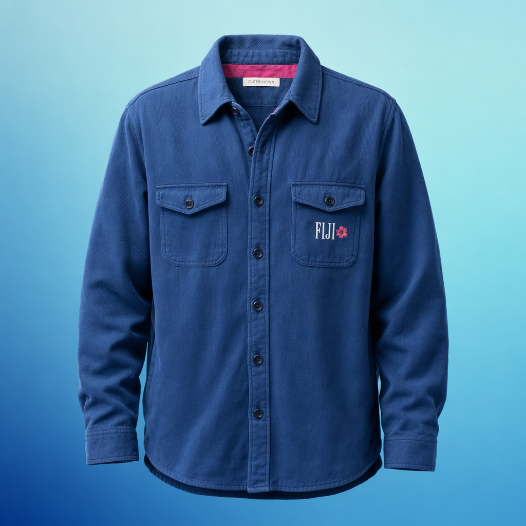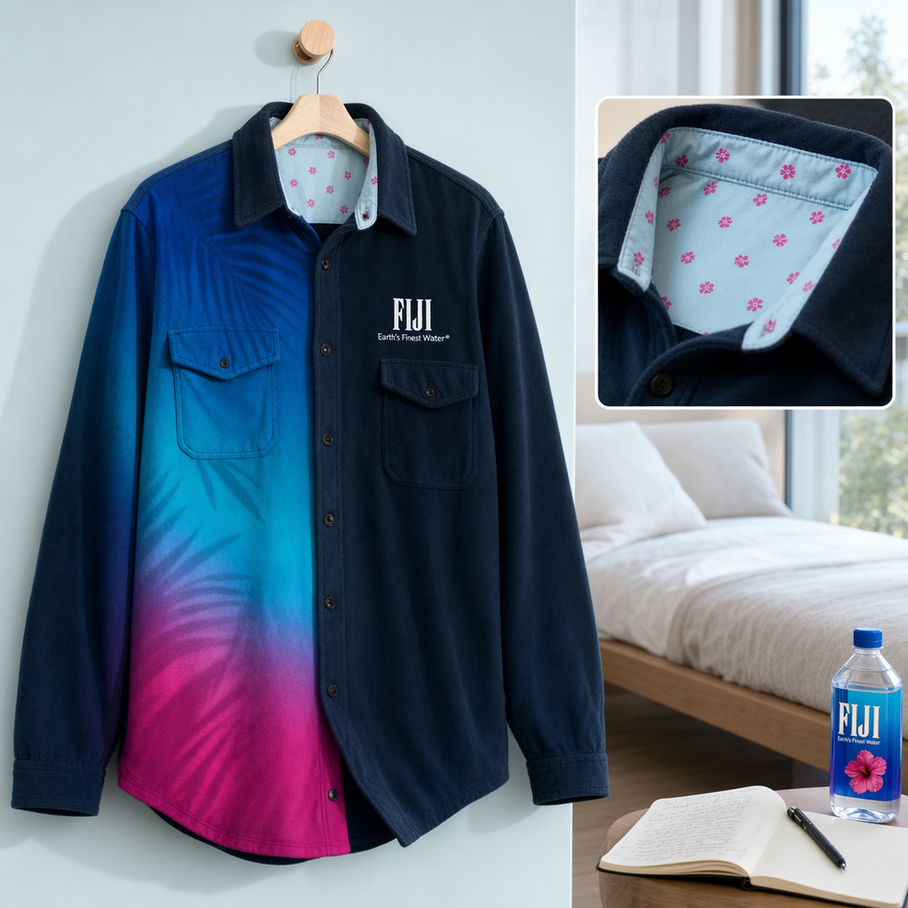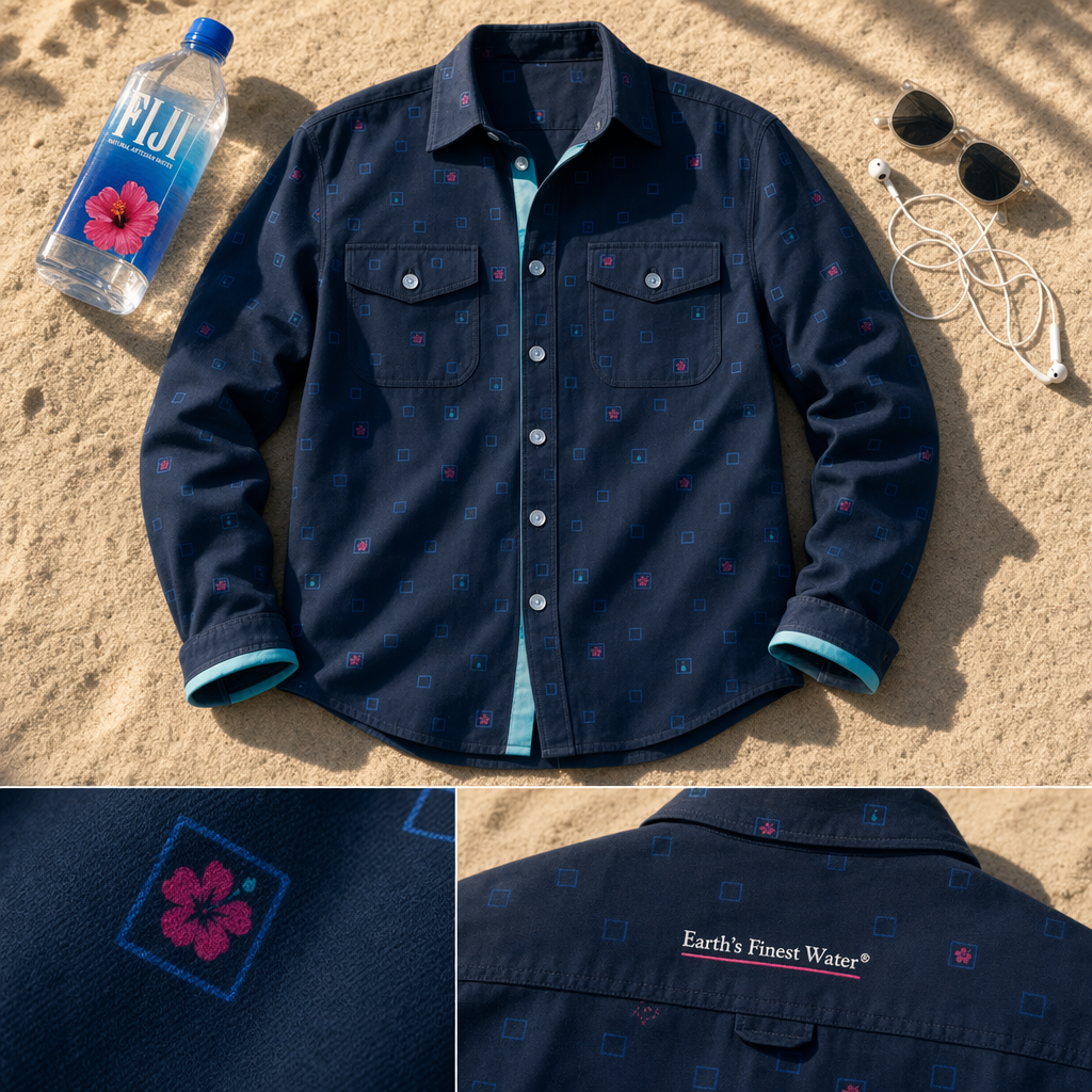 Photorealistic mockup of a FIJI Water "island escape" blanket shirt designed for Gen Z, using the silhouette 10_blanket-shirt-outerworn.jpg as the exact pattern and proportions. The shirt is midweight brushed twill, drapey and soft like a favorite overshirt, with a slightly cropped, boxy fit. Overall base color is deep navy #041C2C, acting as a calm canvas for a playful yet minimal allover pattern inspired by FIJI’s square bottle and hibiscus. Across the shirt, there is a scattered grid of tiny, tonal square outlines in primary FIJI blue #003DA5, and inside some squares, simplified magenta #E10098 hibiscus icons and tiny turquoise #00C1D5 droplets suggesting water. The pattern density is moderate so it feels like a cool fashion print, not merch. Along the inner placket and inside cuffs, there is a hidden gradient tape from light blue #BBDDE6 to bright #00C1D5 that nods to the FIJI bottle gradient; the cuffs are styled slightly flipped to reveal it. On the back yoke, centered just below the neck, a small, crisp print reads "Earth's Finest Water®" in white with a subtle magenta underline, almost like a secret message you only see from behind. Buttons are matte translucent ice-blue, hinting at water. Shot flat-lay on a sandy, sun-kissed surface with soft shadows, a FIJI bottle placed casually near the top corner and a pair of wired earbuds and sunglasses nearby to signal everyday ritual and chill, not performance. Lighting is warm, late-afternoon sun with gentle highlights that make the twill weave and printed pattern feel tactile and premium. Camera is overhead, straight-down view, the entire shirt centered with sleeves slightly bent for shape, plus a tight detail shot of the patterned fabric and back-yoke tagline. Overall mood is laid-back island escape meets trend-driven streetwear, clearly something only FIJI would make due to the square and hibiscus integration and blue + magenta signature pairing.