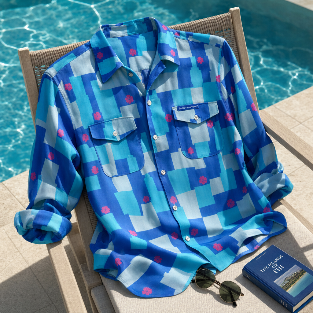 Photorealistic lifestyle-led mockup of a unisex Gen Z-focused FIJI Water resort shirt using the silhouette 05_chroma-blanket-shirt-outerworn.jpg as the exact shape and proportions. Fabric is lightweight, breathable Tencel or rayon with a very soft drape and subtle sheen, evoking liquid luxury but still casual. All-over pattern turns the FIJI brand into a playful, wearable escape: an abstract checker of soft squares referencing the FIJI bottle shape, in alternating blocks of FIJI electric blue (#003DA5), bright light blue (#00C1D5), and ice blue (#BBDDE6), with small scattered magenta hibiscus icons (#E10098) peeking out in some squares like a hidden print. Pattern scale is mid-sized so it feels modern, not loud or touristy. Camp-style collar slightly open, sleeves rolled once for a relaxed, beach-after-work energy. On the left chest, a tiny woven label at the pocket edge reads “Earth’s Finest Water®” in clean white type on FIJI blue, subtle but legible; no giant logos. Buttons are pearlized white with a hint of blue reflection. Shirt is shown draped naturally over the back of a pale wood lounge chair at a minimalist poolside deck, next to a closed book and a pair of simple sunglasses — no people visible, suggesting personal ritual and quiet escape rather than party. Background: turquoise pool water with gentle ripples, soft reflections of light dancing on the surface; deck in warm, neutral stone. Lighting is bright but soft late-afternoon sun, warm highlights on the fabric, with subtle, realistic shadows from the chair. Camera angle slightly above and three-quarters, capturing the whole shirt silhouette clearly while showcasing the drape and pattern. The overall vibe is affordable luxury and relaxation, aspirational but attainable, something a trend-setting Gen Z traveler would reach for daily.