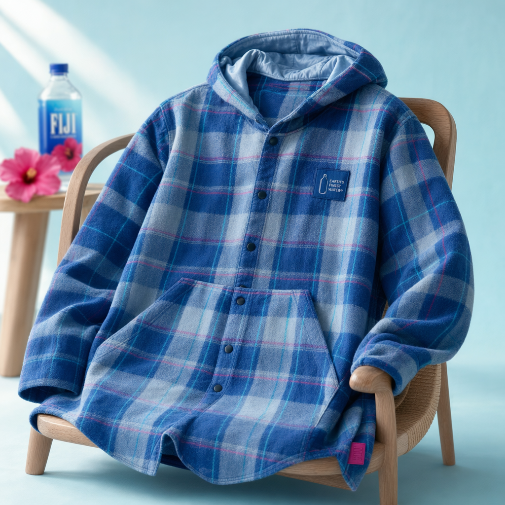 Photorealistic product mockup of a FIJI Water branded blanket-shirt hybrid (use the provided silhouette 06_blanket-shirt-outerworn.jpg for precise shape and proportions). The garment is designed for Gen Z as an “affordable luxury” comfort piece for at-home and beachside relaxation. Material: ultra-soft, midweight brushed cotton-blend flannel exterior with a silky, cooling TENCEL-like inner lining to evoke the smoothness of FIJI water. Color and pattern: oversized, relaxed check pattern built from FIJI’s core palette — primary FIJI blue (#003DA5) squares, light ice blue (#BBDDE6) squares, intersecting fine lines of bright light blue (#00C1D5), with subtle magenta (#E10098) pinstripes running through the grid to echo the hibiscus accent. Overall effect feels fresh, coastal, and slightly fashion-forward, not loud. Branding: on the left chest, a small, woven square patch that nods to the iconic FIJI bottle shape, with minimalist “Earth’s Finest Water®” text in white on FIJI blue, no large logo splash. Another tiny tonal FIJI wordmark is subtly debossed on a magenta hem tab at the lower side seam. Styling details: generous hood following the silhouette, drop shoulders, roomy sleeves, slightly cropped length hitting upper thigh, and a kangaroo pocket whose check pattern is carefully aligned to signal premium construction. Buttons or snaps are matte, matching FIJI navy (#041C2C), low-sheen to avoid flashiness. Surface finish: soft, matte, tactile; the brushed texture should be clearly visible in close-up. Scene and context: garment displayed on a minimalist light-blue (#BBDDE6) background that softly gradients into bright light blue (#00C1D5), suggesting a misty, aquatic atmosphere without literal water splashes. The blanket-shirt is shown on a simple wooden chair with soft curves, draped as if recently taken off after a relaxing beach walk — sleeves relaxed, hood slightly collapsed, one side of the hem touching the floor. Natural daylight from the left, soft and diffused, creating gentle shadows and highlighting the fabric’s depth. In the background, a subtle, out-of-focus hint of a FIJI bottle silhouette and a magenta hibiscus flower on a side table, but kept minimal and tonal so the garment remains the hero. Camera: three-quarter view at mid-height, slightly above eye-level, capturing the full silhouette, hood, pocket, and patch details. Overall mood: laid-back, cool, well-traveled, effortlessly stylish loungewear for everyday rituals — studying, scrolling, journaling, or after-swim chill — clearly positioned as a fashion item Gen Z would actually wear, not just swag.