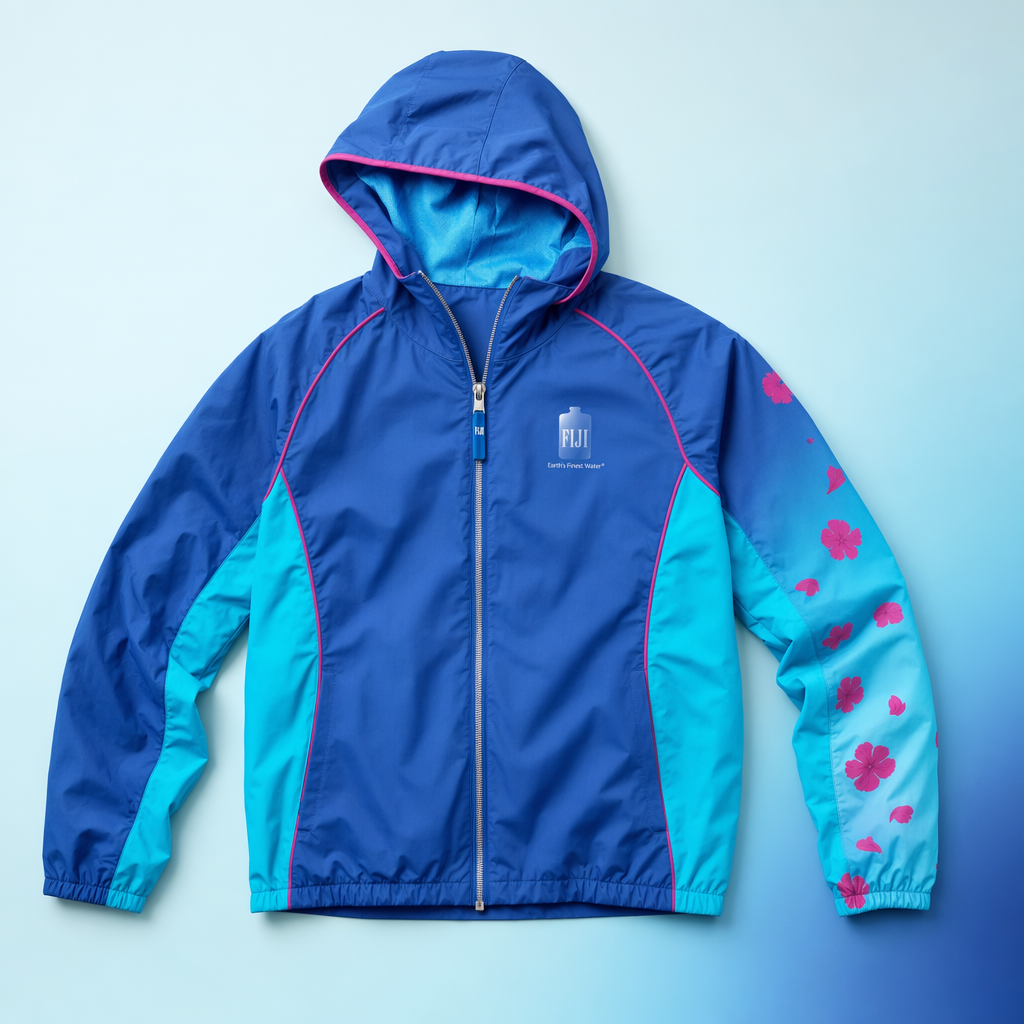 Photorealistic studio render of a unisex FIJI Water ‘sea-suit’ inspired lightweight zip-front jacket, using the provided silhouette image 07_s-e-a-suit-final-sale-outerworn.jpg as the exact garment shape. The jacket is cut from smooth, slightly structured recycled nylon with a subtle matte-sheen finish, positioned flat-lay on a seamless background. Color blocking is bold and Gen Z-focused: primary FIJI blue (#003DA5) body, bright light blue (#00C1D5) panels along the sides and inner sleeves, and hibiscus magenta (#E10098) piping tracing select seams and the edge of the hood for a playful, sporty-lounge energy (but not hardcore performance). Front zipper in clean brushed silver with a FIJI-blue pull tab. On the left chest, a small, tonal FIJI square icon referencing the bottle shape, in slightly glossy ink that catches the light, with the line “Earth’s Finest Water®” very small and clean beneath it in white, feeling more like a signature than a logo splash. Along one sleeve, a soft gradient band from FIJI blue to bright light blue, echoing the bottle’s water gradient, with small scattered hibiscus petal silhouettes in magenta, arranged sparsely so it remains elevated and wearable. Fabric texture clearly visible: high-quality, recycled nylon with fine weave, no wrinkles or cheap shine. Background is a soft ice-blue (#BBDDE6) to navy gradient, top lit with diffused daylight from above and slightly to the left, creating gentle shadows and a relaxed, beach-adjacent mood, like pre- or post-ocean ritual. Camera angle is a top-down flat-lay, slightly offset, focusing on the whole jacket within frame with some negative space. No people, no props, no text overlays beyond the printed design on the garment. Mood: laid-back, cool, well-traveled, affordable luxury streetwear piece that feels like an everyday escape layer for Gen Z.