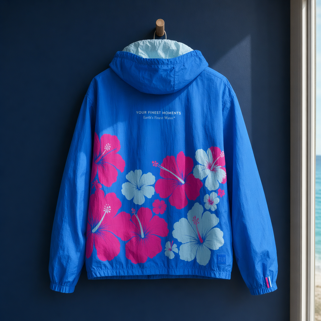 Photorealistic lifestyle render of a unisex FIJI Water ‘sea-suit’ windbreaker using silhouette 07_s-e-a-suit-final-sale-outerworn.jpg as the exact shape, shot hanging on a simple wood peg against a deep navy (#041C2C) wall for a premium yet relaxed apartment-by-the-ocean vibe aimed at Gen Z. The jacket fabric is ultra-light recycled ripstop with a soft, almost papery hand, finished matte with subtle textural squares visible up close. Primary color is a trending electric FIJI cornflower blue (between #003DA5 and #00C1D5), with oversized, soft-edged hibiscus florals in magenta (#E10098) and light blue (#BBDDE6) drifting across the back panel like a dreamy print—clustered toward the lower half so the top stays calmer and more wearable. On the back upper center, integrated into the print but clearly legible, a small white stacked typographic lockup: “YOUR FINEST MOMENTS” on one line and “Earth’s Finest Water®” beneath, in clean, modern sans serif, feeling like a mantra instead of a logo. The front is mostly solid electric blue, with only a minimal tonal FIJI square icon near the hem and a micro woven label at the cuff using FIJI blue and magenta stripes. Hood lined in light blue (#BBDDE6) that subtly peeks out. Metal hardware is brushed silver; zipper pull has a tiny translucent square charm echoing the FIJI bottle. Natural window light from the right, warm late-afternoon tone, creates soft highlights on the ripstop texture and gentle shadow on the wall, evoking relaxation and escape after a beach day. Camera framing: straight-on mid shot that shows the full jacket and a bit of wall around it, no model visible, no extra props, no additional text. Overall mood: effortless, fashion-forward, not sporty performance; an affordable luxury ritual piece that feels collectible and distinctly FIJI.