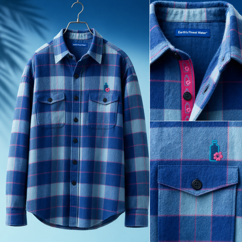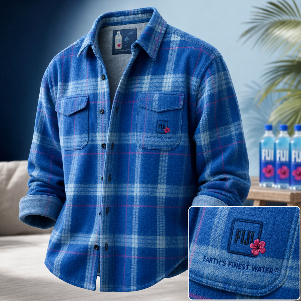 Photorealistic studio mockup of a unisex FIJI Water “blanket shirt” inspired outerwear for Gen Z, using the provided silhouette 08_blanket-shirt-outerworn.jpg as the exact garment shape. The shirt is made from a soft, midweight brushed cotton-flannel blend that looks cozy and relaxed, slightly oversized with dropped shoulders and rounded hem. Main color is FIJI primary blue (#003DA5) in a large, modern check pattern, paired with light ice blue (#BBDDE6) squares and thin hibiscus magenta (#E10098) accent stripes running through the plaid, creating a playful but elevated grid. Buttons are matte navy (#041C2C) with subtle engraved FIJI square icon, no large logos on front. On the left chest, a small, tonal embroidered FIJI square bottle icon in slightly brighter blue (#00C1D5) with a tiny magenta hibiscus detail—tasteful, not loud. Across the inner collar, a woven neck label in FIJI blue reading “Earth’s Finest Water®” in clean white type, clearly visible with the top button open. Inside placket seam features a hidden magenta tape printed with a tiny repeating hibiscus and square-bottle pattern, shown in a close-up inset for social-friendly detail. Styling: shot hanging on a simple brushed metal hanger, against a softly blurred gradient background fading from deep FIJI navy at the top to pale ice blue at the bottom, with a subtle out-of-focus tropical leaf shadow suggesting island escape. Soft, diffused daylight-style lighting from front-left, gentle shadows, making the flannel texture and brushed fibers clearly visible. Camera framing: hero shot at 3/4 front, mid-torso crop, plus a secondary close-up of the chest pocket embroidery and inner collar label. Overall mood: laid-back, cool, affordable luxury; something a well-traveled Gen Z creator would wear post-beach or to a coffee run, effortlessly stylish rather than flashy.
