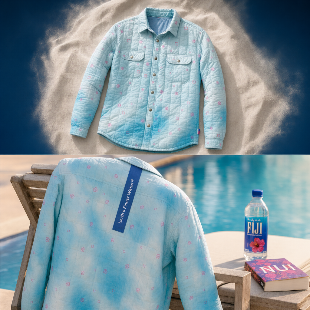 Photorealistic lifestyle and studio hybrid mockup of a FIJI Water Gen Z “island cloud” shacket using the silhouette 08_blanket-shirt-outerworn.jpg as the exact shape. The garment appears as a lightly quilted, ultra-soft shirt-jacket, slightly puffy but still drapey, made from a premium recycled microfiber shell with a subtle satin-matte sheen, lined with smooth jersey for comfort—an affordable luxury layer for travel and lounging. Base color is very light blue (#BBDDE6) with a soft, organic gradient wash in bright FIJI aqua (#00C1D5) and hints of FIJI blue (#003DA5), evoking the FIJI bottle’s oceanic gradient. Over this sits a minimal, tonal all-over pattern of tiny square outlines and hibiscus icons in pale magenta (#E10098), spaced playfully but not loud. Snap closures are brushed silver with a tiny debossed square, catching light. On the back yoke, a clean vertical strip in FIJI blue runs from collar to mid-back, with small white text reading “Earth’s Finest Water®” centered; this back-detail is clearly visible in one angle. Front branding stays subtle: a small woven label at the lower side seam combining FIJI blue and magenta stripes, no big front logo. Scene 1 (studio hero): shirt laid flat on a slightly wrinkled, sand-colored surface, with soft natural top light creating gentle shadows that highlight the quilting lines and pillowy texture, background softly transitioning to navy (#041C2C) vignette at edges to echo evening escape. Scene 2 (lifestyle): the shirt draped casually over a sun-bleached wooden lounge chair by a pool, with a blurred FIJI bottle and a paperback book in the background, shot at golden hour with warm side light and cool blue pool reflections, out of focus. Camera framing: overhead flat-lay for texture and pattern clarity, and a 3/4 back view on the chair to showcase the vertical “Earth’s Finest Water®” strip. Overall vibe: effortless, travel-ready relaxation, a piece a Gen Z traveler would throw over a tank top after a swim—playful, personal, and quietly premium, rooted in FIJI’s blue-and-magenta language and island escape story.