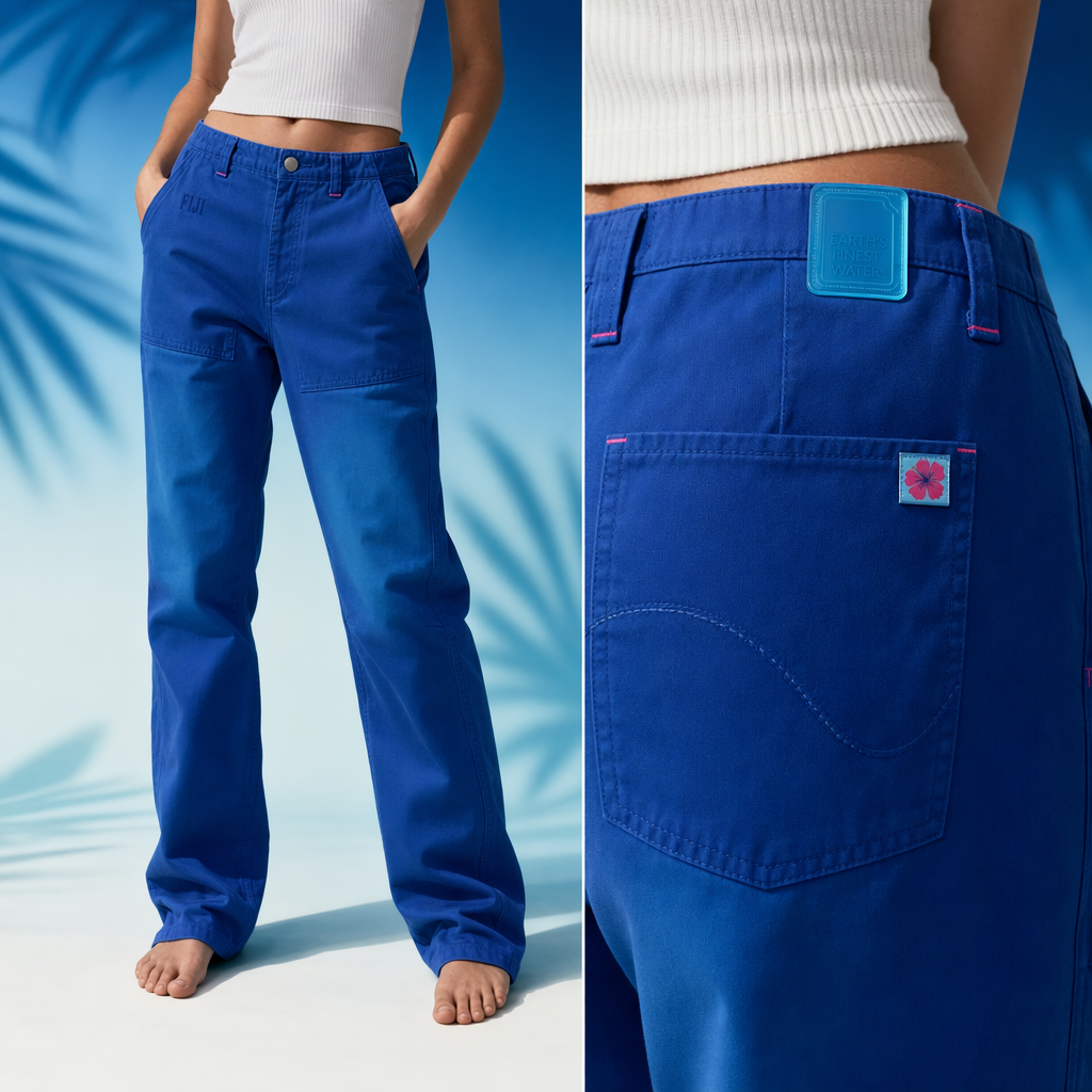 Photorealistic studio mockup of a unisex relaxed straight-leg pant using the provided silhouette 09_the-field-pant-outerworn.jpg. The design is Gen Z focused, inspired by FIJI Water’s ‘Earth’s Finest Water®’ positioning: relaxed escape, affordable luxury, playful but effortless. Material: premium midweight organic cotton twill with a hint of stretch, smooth yet matte, designed as an everyday ritual pant for coffee walks, beach days, and airport lounging. Colorway: FIJI electric blue (PMS 293 / #003DA5) as the main body, with subtle tonal paneling on knees and seat in a slightly lighter FIJI blue gradient inspired by the bottle (PMS 3115 / #00C1D5). Signature FIJI blue + magenta pairing: clean magenta (PMS Rhodamine / #E10098) bartack stitching at pocket corners and a slim magenta piping hidden along the inside of the waistband, just visible when the waist is folded over. Distinctive FIJI details only this brand would use: a small, woven hibiscus icon tag in magenta and light blue at the right back pocket, a minimalist tonal FIJI wordmark embroidered above the left front pocket in deep navy (PMS 296 / #041C2C), and a square, FIJI-bottle-inspired rubberized patch in transparent ice-blue on the back waistband, with ‘Earth’s Finest Water®’ subtly debossed. Hardware: matte brushed silver snap and zipper with no shine, for a premium but not ostentatious look. Pockets: front slant pockets and a single back patch pocket with a gentle curved stitch line, referencing ocean waves. Fit and styling: shown high-waisted on a torso-down model, styled with an easy white ribbed tank and barefoot at the hem to convey laid-back island escape. Lighting: soft, diffused daylight from the upper left, creating gentle shadows and dimensional folds in the fabric, like natural window light in a beach apartment. Background: seamless gradient backdrop shifting from light FIJI blue (#BBDDE6) at the bottom to deeper FIJI blue (#003DA5) at the top, subtly blurred hibiscus and palm leaf shadows in the background to hint at Fiji without becoming a print. Camera framing: primary shot is a full-length front 3/4 view at hip height, with a secondary close-up crop showing waistband, hibiscus tag, and tonal logo embroidery to highlight premium details. Overall mood: calm, well-traveled, confident, with an understated ‘this is my everyday escape pant’ energy, targeted at Gen Z trendsetters who value wellness and subtle flex over logos.