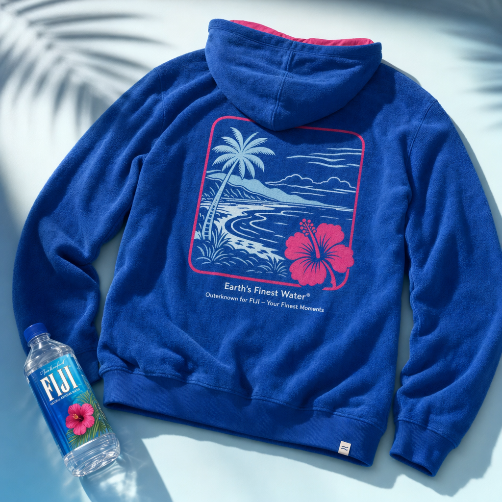 Photorealistic studio shot of a unisex, relaxed-fit beach hoodie from an imagined Outerknown x FIJI Water collaboration, laid flat with slight natural folds. The hoodie is made from ultra-soft organic cotton terry, mid-weight, with a premium feel. Primary color is FIJI electric blue (#003DA5 / #00C1D5 gradient-inspired) with a subtle tonal wave texture in the knit to evoke water ripples. On the back, a large square graphic nods to the FIJI bottle shape: a soft-edge square frame in FIJI blue with a hibiscus magenta (#E10098) outline, inside a minimalist line-art illustration of a Fijian shoreline and palm in light blue (#BBDDE6). Centered under the graphic, small, clean white type: “Earth’s Finest Water®” and below it “Outerknown for FIJI – Your Finest Moments” in a modern, Gen Z-friendly sans-serif. On the front left chest, a tiny co-branded lockup: Outerknown wave logo in white paired with the FIJI logotype in FIJI blue, separated by a slim magenta bar. Hood interior is lined with a hibiscus-pink jersey for a hidden pop of color when the hood is down. Drawcord tips are dipped in magenta and cap-blue to echo the FIJI bottle cap. Background is a softly lit, sun-drenched studio setup suggesting coastal escape: a pale gradient from navy (#041C2C) at the top fading into light blue (#BBDDE6) at the bottom, with faint out-of-focus palm shadows. Lighting is natural and airy, like late-afternoon beach light streaming from the upper left, creating soft highlights on the fabric and gentle shadows. Camera is overhead, slightly angled for dimension, capturing the full hoodie, with a glass bottle of FIJI water placed casually near the cuff to reinforce the collaboration and lifestyle ritual of post-beach relaxation. Hyper-realistic texture detail showing fabric loop, stitching, and drawcord weave.