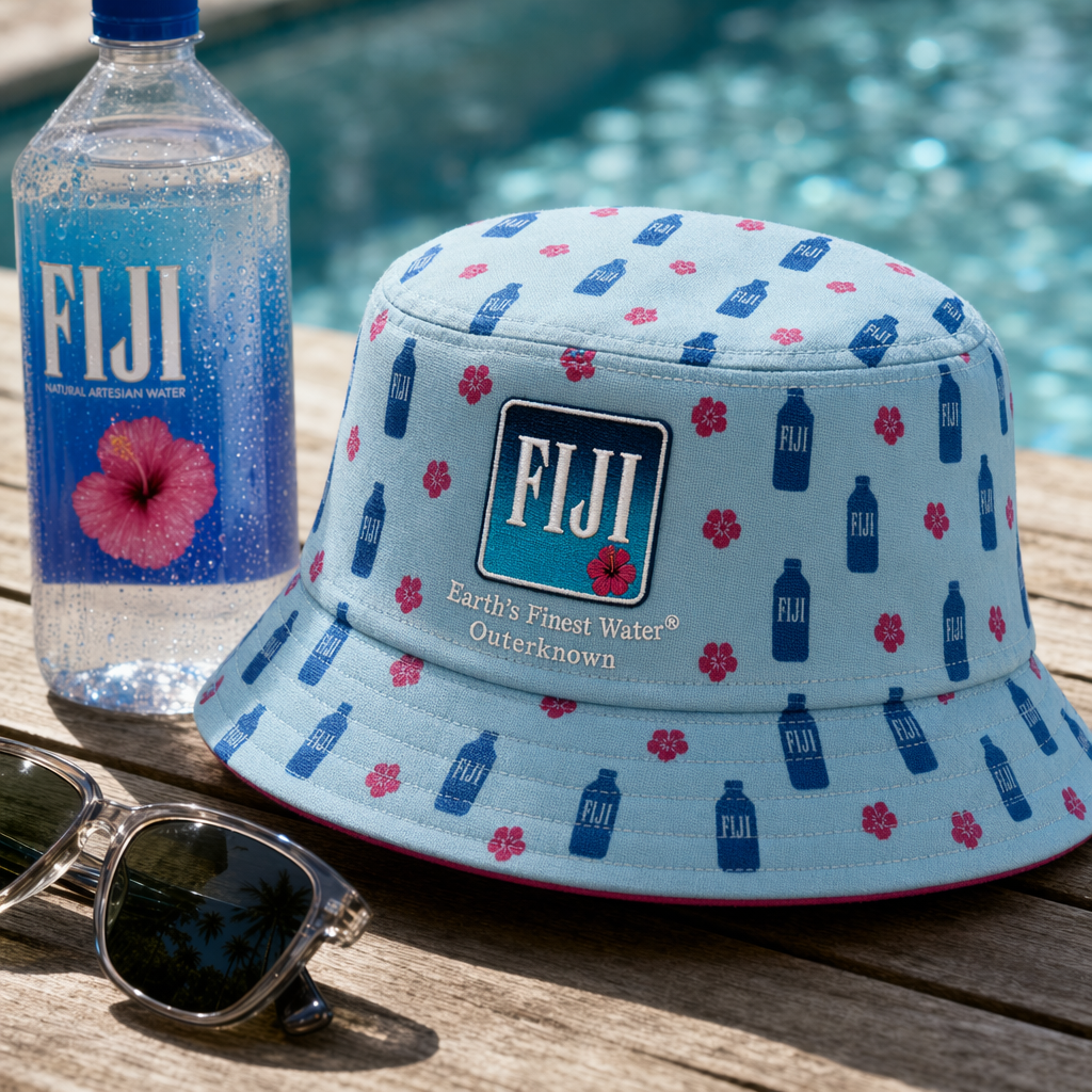 Photorealistic close-up lifestyle shot of a sustainable, unisex bucket hat from an Outerknown x FIJI Water collaboration, styled for Gen Z. The hat is made from recycled cotton-canvas blend, structured but soft, with visible fine weave and slightly curved brim. Base color is light ocean blue (#BBDDE6) with an all-over, playful yet minimal pattern of tiny FIJI bottle silhouettes and hibiscus flowers in FIJI blue (#003DA5) and magenta (#E10098), arranged in a loose grid that feels casual not busy. On the front center of the crown, an embroidered square patch referencing the FIJI bottle label: gradient blue background from navy (#041C2C) at the top to bright light blue (#00C1D5) at the bottom, with crisp white “FIJI” lettering and a small magenta hibiscus icon in the corner. Under the patch, small curved embroidery in white reading “Earth’s Finest Water®” and “Outerknown” below it, understated and premium. The underside of the brim is solid magenta for a bold yet hidden pop of color visible only at certain angles, signaling playful ‘affordable luxury.’ Shot outdoors on a sun-bleached wooden deck near a pool, the hat resting next to a pair of laid-back sunglasses and a FIJI water bottle beading with condensation. Background has softly blurred turquoise water bokeh and faint palm reflections, evoking relaxation and escape. Lighting is bright natural midday sun with gentle shadows, emphasizing the texture of the embroidery and canvas. Camera framing is three-quarter close-up from slightly above, focusing on the hat’s crown and patch, with crisp depth of field on the merch and soft blur on the environment, delivering an aspirational but effortless, everyday-vacation feel.
