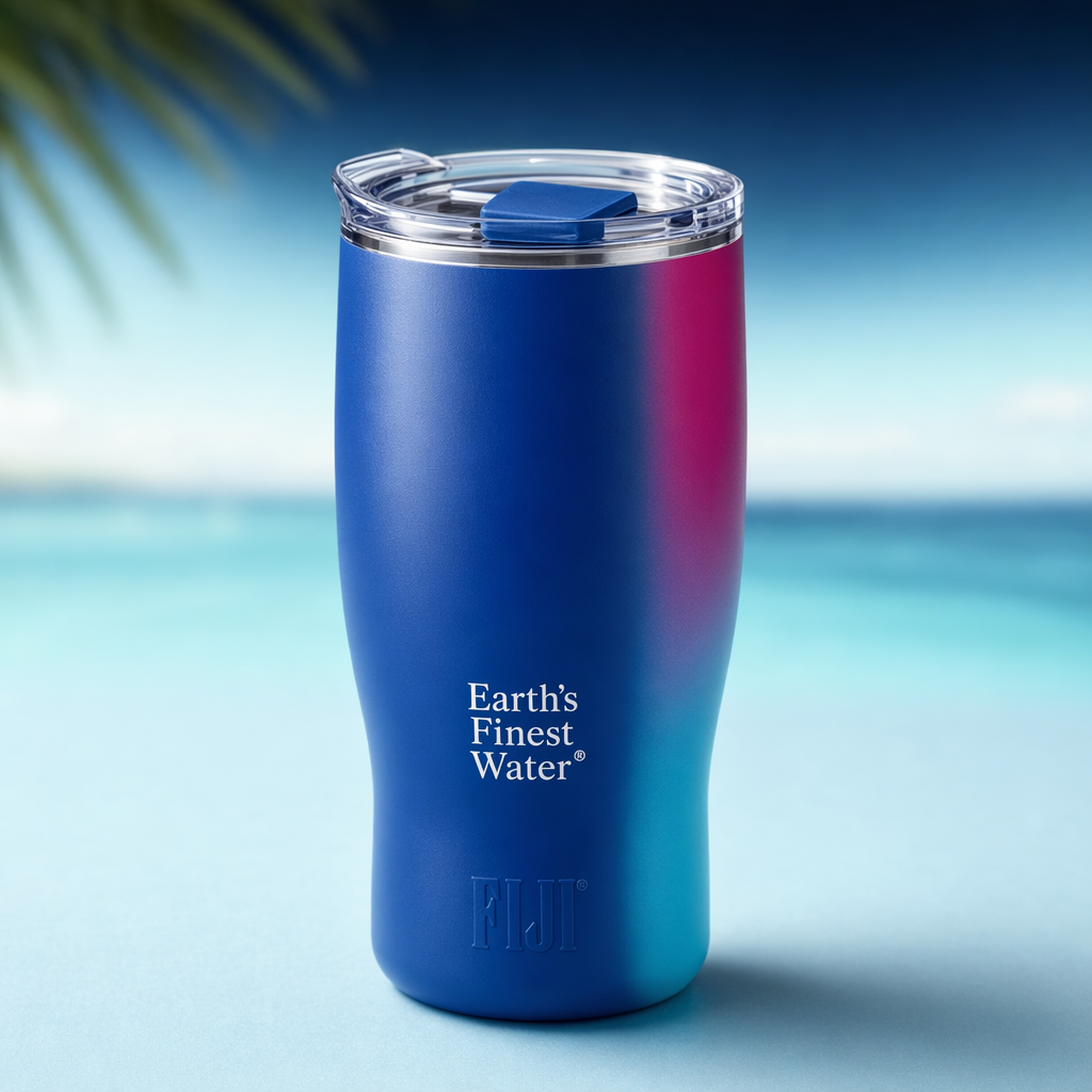 Photorealistic studio product shot of a FIJI Water inspired insulated drink tumbler, using the provided silhouette image as the exact product shape. Double-wall stainless steel body with a smooth, satin-matte powdercoat in rich primary FIJI blue (#003DA5) as the main color. A subtle, vertical gradient panel on one side shifts from bright light blue (#00C1D5) at the bottom into hibiscus magenta (#E10098) at the top, echoing the FIJI bottle’s water-to-flower feel. On the front, a refined “Earth’s Finest Water®” line in clean white, with a small, tonal FIJI wordmark embossed near the base for an understated, premium branding moment. The lid is crystal-clear, high-gloss Tritan with a soft-touch slider in cap blue (#005EB8), hinting at the iconic bottle cap. Interior visible as brushed stainless steel, catching light. Surface finish is elevated but approachable: no chrome, no metallic logos, just luxe color and texture. Lighting is soft and coastal: diffused daylight from upper left, subtle reflections on the powdercoat, gentle highlight on the lid, very light shadow on the right. Background is a minimal FIJI escape: an ice-blue field (#BBDDE6) that gradient-fades into a deeper navy (#041C2C) at the top, with a faint, out-of-focus suggestion of palm fronds and ocean horizon, bokeh only, no hard edges. Camera framing is a straight-on hero shot at tabletop height, slight 3/4 turn to reveal silhouette curves and lid details, product centered with ample negative space to feel calm, laid-back, and aspirational yet everyday. No other objects in frame, no people, no clutter.
