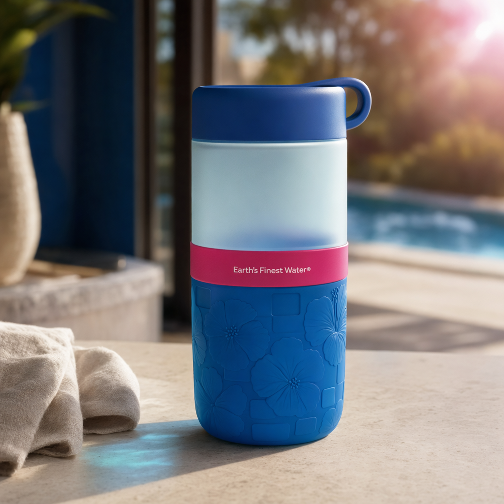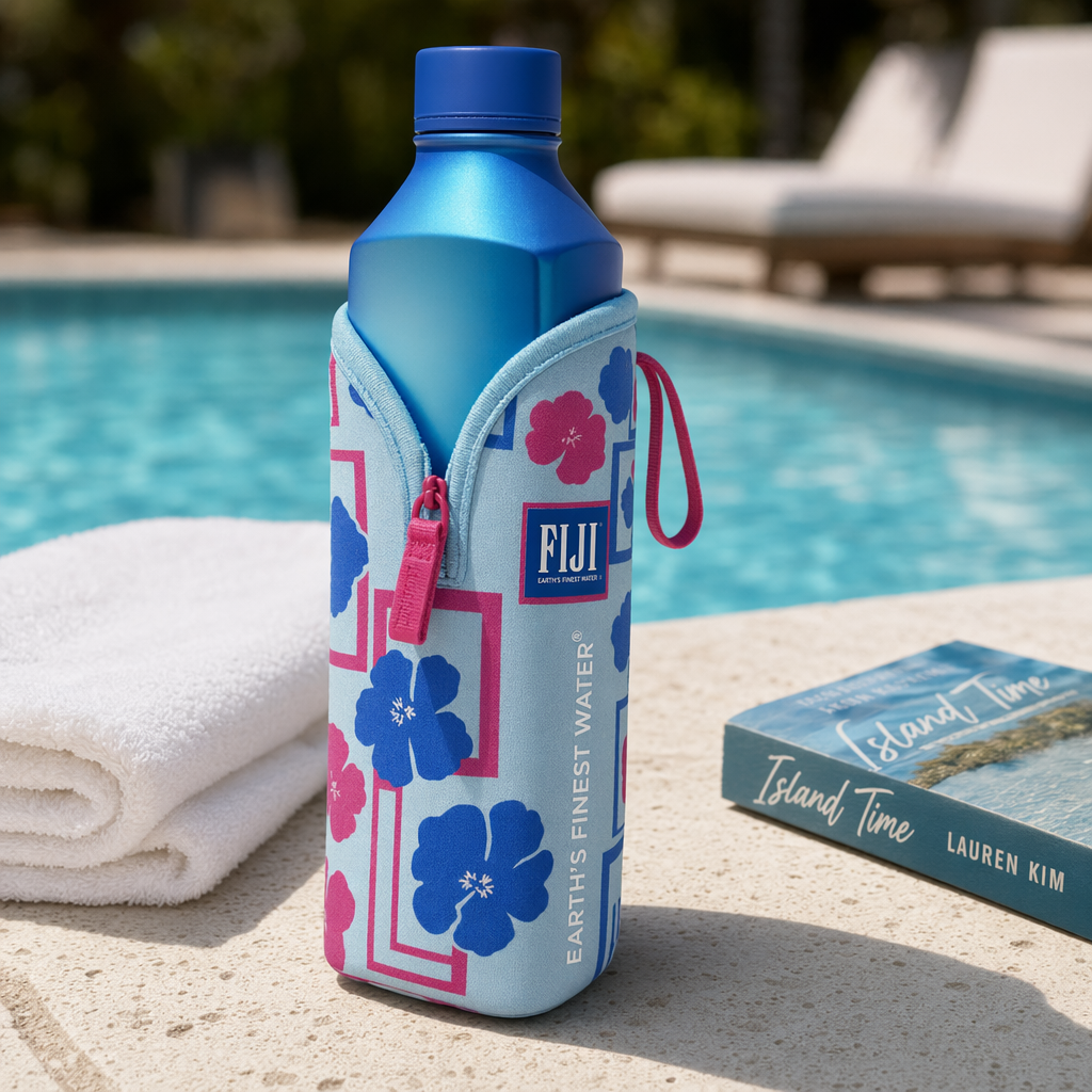 Photorealistic render of a FIJI Water “poolside ritual” insulated bottle and soft-touch sleeve set, positioned as playful, effortless, everyday luxury for relaxation and escape. The main object is a slim, double-wall stainless steel bottle with a slightly squared profile hinting at the iconic FIJI bottle silhouette, finished in a satin FIJI blue (#003DA5) with a subtle blue-to-bright-light-blue (#00C1D5) vertical gradient. Over it, a removable neoprene sleeve in ice-light blue (#BBDDE6) features an abstract all-over pattern of tonal hibiscus motifs and square outlines in FIJI blue and magenta (#E10098), leaning into blue + magenta as the signature pairing. The FIJI logo is small and confident on the sleeve, with “Earth’s Finest Water®” printed along the side in clean white type. A matching magenta zipper pull tab and a slim magenta carry loop add a stylish but not ostentatious pop of color. The cap references the FIJI bottle cap color (#005EB8) in a soft-matte finish. Surface finishes: bottle is satin, sleeve is slightly textured neoprene, cap is matte, giving a premium but approachable feel. Scene: the bottle rests on the edge of a sunlit pool deck with a soft FIJI-blue-tinted pool in the background, slightly out of focus, plus a folded white towel and a paperback book nearby, conveying laid-back, well-traveled, healthy vibes. Lighting is bright but soft midday sun with gentle reflections, no harsh glares. Camera: medium close-up from a low 3/4 angle, focusing sharply on the bottle and sleeve, with bokeh on the water and surroundings, styled like a modern fashion accessory shot rather than hardcore sports gear.