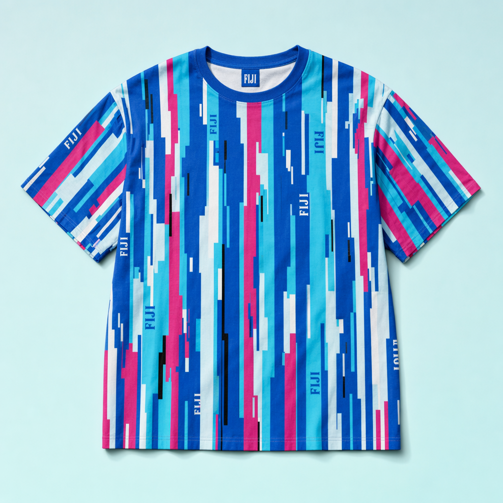 Photorealistic flat-lay of a unisex short-sleeve FIJI Glitch Stripe Tee on a clean studio background. The t-shirt is high-quality midweight cotton with a smooth, slightly lustrous finish, cut in a relaxed, slightly boxy fit. All-over print of vertical glitch bars runs from collar to hem and sleeve to sleeve: varying widths of stripes in FIJI primary blue (#003DA5), bright light blue (#00C1D5), light ice blue (#BBDDE6), hibiscus magenta (#E10098), crisp white, and deep navy (#041C2C), with occasional slim black lines to emphasize the digital glitch effect. The stripes are imperfect, with pixel-like breaks, offset segments, and subtle jitter that feels playful and fashion-forward rather than techy. Hidden within the pattern are tiny fragmented “FIJI” wordmarks: some rotated 90 degrees, some sliced or partially cropped, all in FIJI blue or white, blending into the stripes so they’re only visible on closer inspection. A small, clean FIJI logo lockup in white sits at the center back just below the collar, very minimal. Lighting is soft and even from above, with gentle shadows around the edges of the tee to show volume and fabric texture. Background is a seamless light blue field (#BBDDE6) with a very subtle gradient, creating a relaxed, airy mood. Camera angle is top-down, framing the full shirt with a bit of negative space around it, hero-ing the pattern as an elevated, everyday-cool piece rather than loud streetwear.