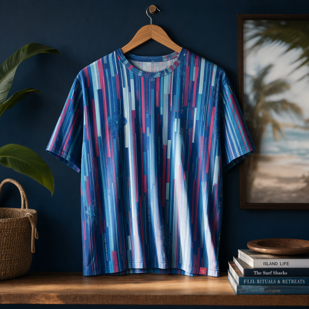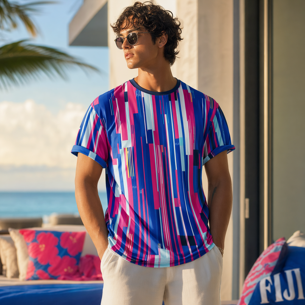 On-body lifestyle shot of a unisex FIJI Glitch Stripe Tee styled as affordable luxury street-resort wear. The model stands casually on a sunlit modern terrace with soft-focus hints of palm leaves and ocean blues in the background, evoking relaxed island escape. The t-shirt is premium combed cotton with a slightly drapey, fluid handfeel, worn untucked with cuffed sleeves. All-over vertical glitch stripes run down the entire shirt: layered bars in FIJI blue (#003DA5), bright light blue (#00C1D5), hibiscus magenta (#E10098), light blue (#BBDDE6), white, and deep navy (#041C2C), interspersed with subtle black accents. The glitch effect feels like a distorted waterfall: some stripes fade into gradients, some break into pixel shards, some overlap like misaligned scan lines. Hidden “FIJI” text fragments are woven into the glitch bars at chest and lower torso level, very small, partially cropped, almost like easter eggs discovered up close. Across one side seam, a slightly wider stripe subtly shifts into a tonal “Earth’s Finest Water®” micro-print, nearly invisible from distance. Lighting is golden-hour soft with warm highlights on the fabric and gentle shadow contouring the folds, emphasizing the shirt’s smooth texture. Background colors echo FIJI’s palette—blues and magenta accents in decor pillows or a blurred towel—without competing with the tee. Camera is three-quarter waist-up, straight-on, depth of field shallow so the tee’s pattern is sharp and the background luxuriously blurred, delivering a fashion editorial feel that’s effortless, cool, and playful rather than flashy.