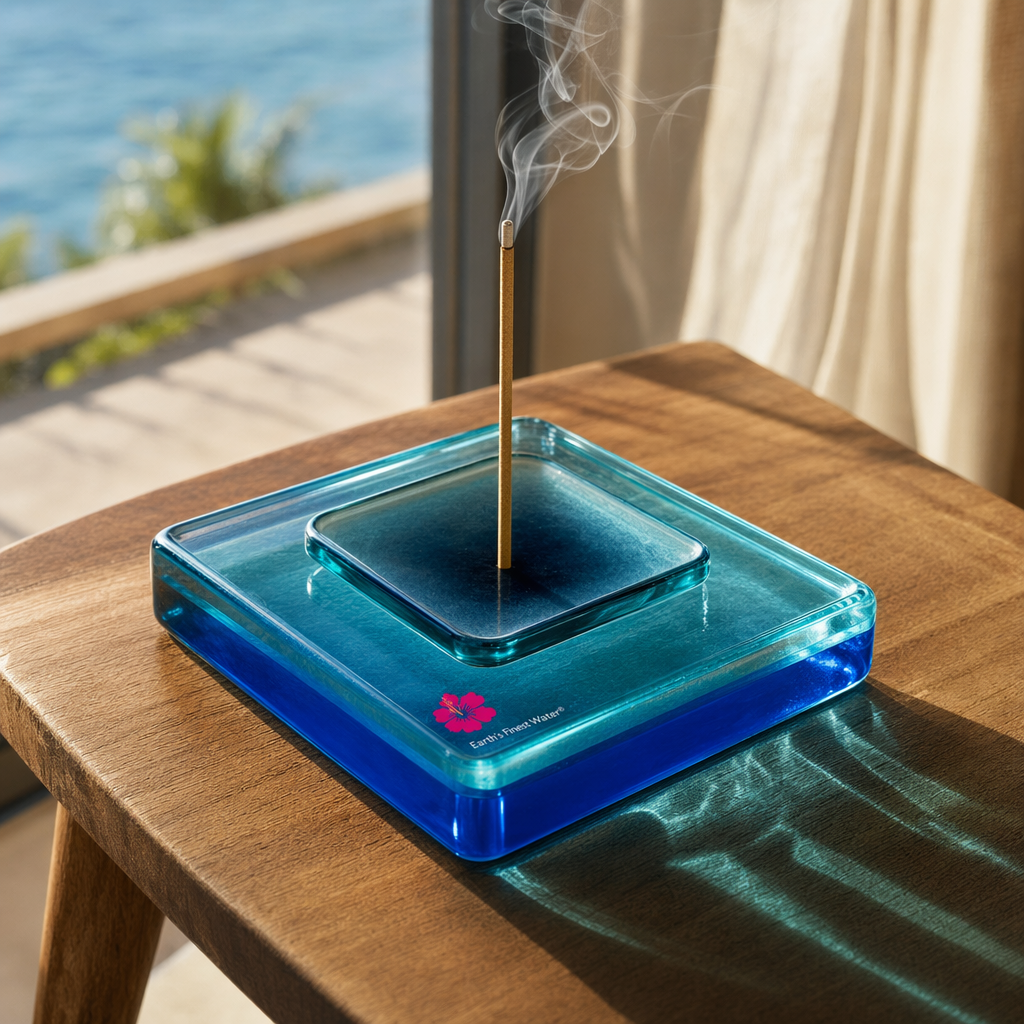Photorealistic close-up of a FIJI Water inspired square glass incense burner and tray set on a low teak side table, styled as a quiet evening unwind ritual in a coastal apartment. The burner base is a thick, perfectly square slab of translucent aqua-tinted glass echoing the FIJI bottle, with a soft gradient from deep FIJI blue (#003DA5) at the bottom to bright light blue (#00C1D5) near the top. A small, subtle hibiscus-pink (#E10098) inlaid icon sits in one corner, paired with a tiny debossed line of text reading “Earth’s Finest Water®” in crisp white, no other copy. The matching tray is a shallow square with softly rounded edges, glass over a navy (#041C2C) backing that fades into light blue (#BBDDE6), creating an underwater lagoon effect. A single thin incense stick in a neutral sand color burns gently, with delicate smoke curling upward, captured sharply in sunlight. Lighting is warm late-afternoon golden hour, streaming in from the left and casting watery caustic reflections through the aqua glass onto the natural wood surface. Background is softly blurred: a hint of an open balcony door, out-of-focus greenery, and a linen curtain moving slightly, suggesting relaxed island air. Camera is a 3/4 angle macro shot focused on the glass edges and smoke plume, highlighting the premium thickness of the glass, smooth polished finish, and the iconic FIJI blue + magenta pairing. Overall mood: affordable luxury, ultra-calming, personal at-home escape, no clutter, no people, just an intimate ritual moment.