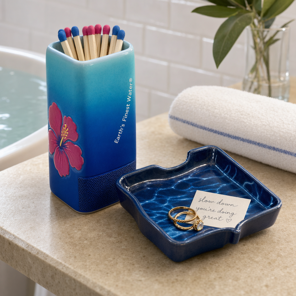 Photorealistic product shot of a FIJI Water inspired ceramic match striker and catch-all bowl set on a stone ledge beside a soaking tub, designed as a small daily ritual object. The striker is a compact cylinder with a subtly squared profile, its outer surface finished in a silky matte FIJI blue (#003DA5) at the base, fading upwards into bright turquoise (#00C1D5). A single embossed hibiscus icon in magenta (#E10098) wraps one corner, with a minimalist white “Earth’s Finest Water®” line following the curve on the reverse side. The top edge reveals a glossy glazed interior in pale ice blue (#BBDDE6), partially filled with neatly arranged wooden matches tipped in alternating FIJI blue and magenta heads. Beside it, a shallow square ceramic catch-all dish with softly bevelled, bottle-like corners holds a few rings and a folded note, glazed in deep navy (#041C2C) with a subtle watery ripple texture in lighter blues. The striker’s lower half features a fine-textured, slightly rough strike surface integrated in a tonal darker blue band. Lighting is soft spa-like, from overhead and a side window, with diffused daylight creating gentle highlights on the ceramic and subtle reflections in bathwater just out of frame. Background is a blurred hint of white tile, a rolled white towel with a faint blue stripe, and a hint of green plant, all minimal. Camera is a slightly elevated close-up shot, focusing on the texture contrast between matte ceramic, glossy glaze, and the colorful match tips, framing the object as an intimate, affordable luxury moment rather than a flashy flex. Color palette leans heavily into FIJI blue + magenta with soft neutrals, no harsh shadows, calm and inviting mood.