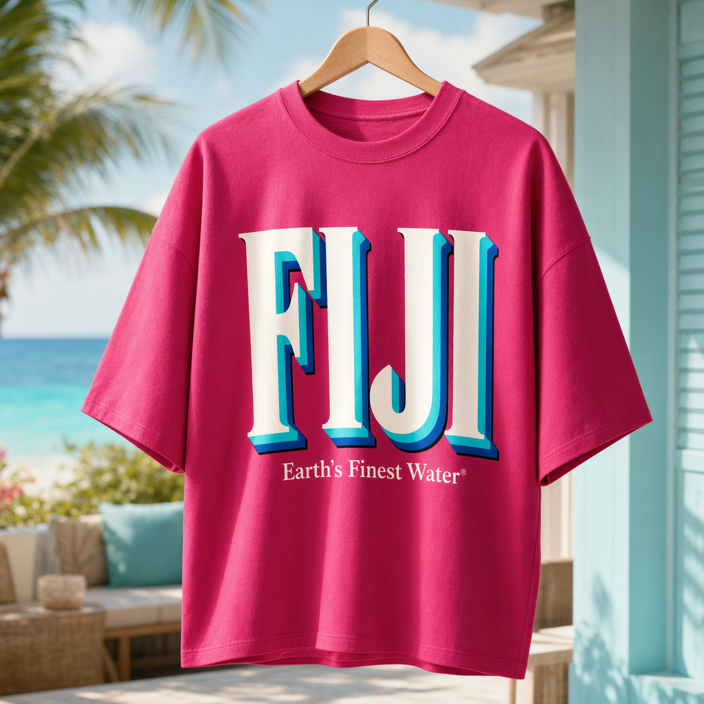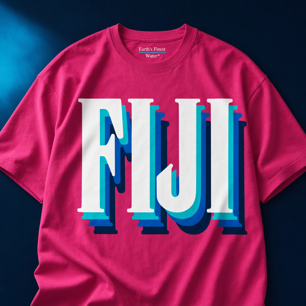 Photorealistic studio shot of an oversized unisex FIJI Water shadow logo T-shirt laid flat on a clean surface. The tee is a rich hibiscus hot pink (PMS Rhodamine #E10098) in a heavyweight, premium cotton jersey with a soft, slightly brushed texture. Boxy, relaxed fit with dropped shoulders, wide collar rib, and slightly longer sleeves to feel like an elevated streetwear staple, not athletic gear. Across the chest, a huge, crisp white FIJI logotype spans almost edge to edge. Behind the white FIJI wordmark, show three bold offset drop shadows stacked diagonally down-right: top layer bright cyan (PMS 3115 C #00C1D5), middle layer primary FIJI blue (PMS 293 #003DA5), bottom layer deep navy (PMS 296 #041C2C). The stacked shadows should feel playful and fashion-forward, like a 90s poster and modern streetwear mashup, clearly celebrating FIJI’s blue + magenta signature pairing. Print is high-end screenprint or water-based ink with a very slight sheen, no cracking, perfectly registered edges. Back of neck has a small, minimal ‘Earth’s Finest Water®’ lockup in white and FIJI blue, centered below the collar. Lighting: soft, diffused daylight from top-left, creating gentle folds and subtle shadows that show the weight and drape of the fabric. Background: smooth navy (#041C2C) or very deep blue gradient that subtly echoes FIJI water depth, with a faint out-of-focus splash of lighter cyan in one corner to hint at water without being literal. Camera angle: top-down flat lay, tightly framed on the torso area so the giant logo and layered shadows are the hero. Overall mood: laid-back, confident, affordable luxury streetwear for everyday rituals, not sporty or performance-oriented.